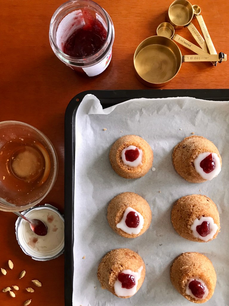 Poi sulla parte alta, mettete la glassa ottenuta dallo zucchero a velo e un cucchiaino di marmellata di lamponi che probabilmente era l’unica marmellata che la signora Runeberg aveva in casa, perché le ricette classiche non prevedono altra aggiunta… dunque, astenersi fragole o mirtilli…