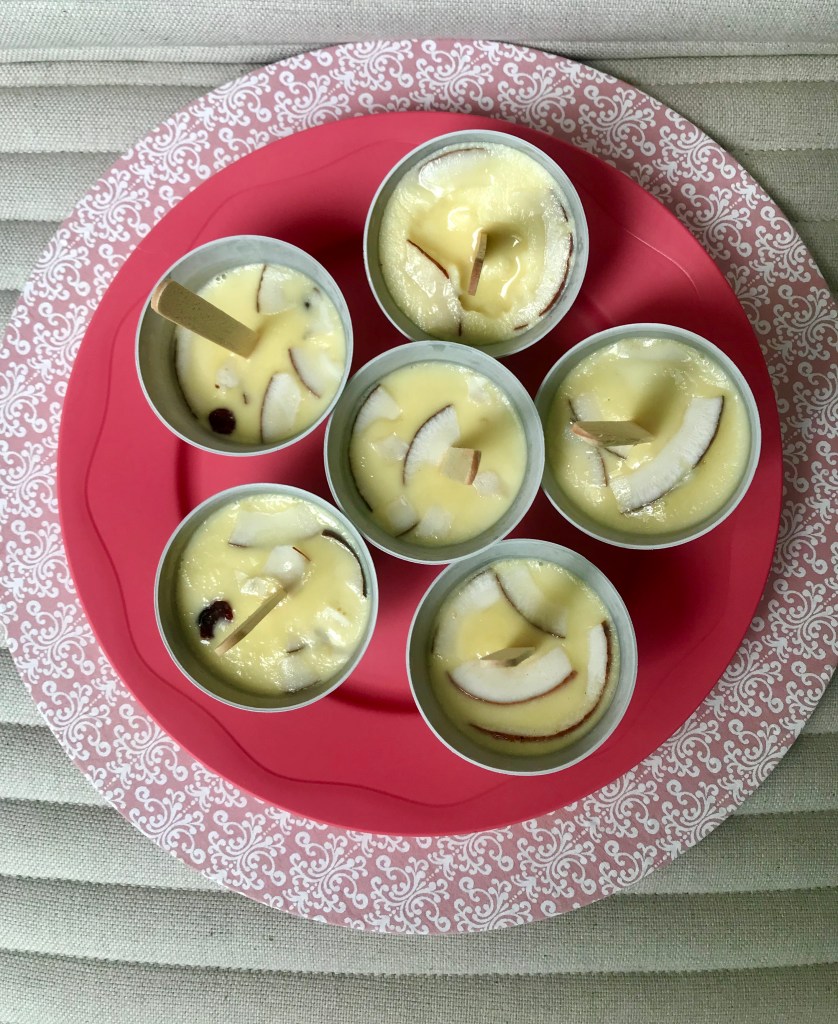 – Inoltre, su consiglio di Erin Jeanne McDowell, nota instagrammer e autrice di The Fearless Baker, Kristen Miglore suggerisce che si collochino nei kulfi, poco prima di congelarli, sulla parte inferiore, quella cioè che rimane scoperta, degli ingredienti come petali di rosa essiccati o pistacchi tritati. Io ho usato cocco essiccato e cranberries. Buonissimi.