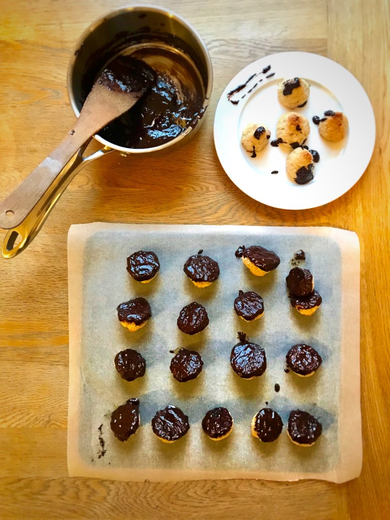 Far fondere metà del cioccolato a bagnomaria, togliere il pentolino dal fuoco e unite immediatamente l’altra metà di cioccolato, mescolando bene. Aspettare due minuti fino a che il cioccolato non risulti sciolto, quindi, con cura, intingere la base di ogni dolcetto nel cioccolato fuso, e far raffreddare completamente, prima di mangiare.