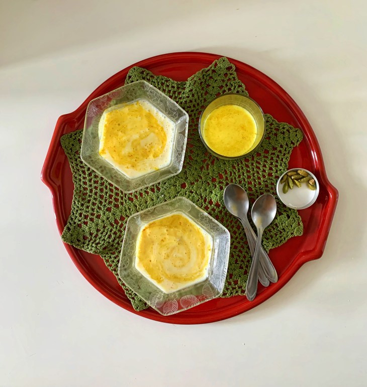 Lo “Shrikand” è un dessert tradizionale dello Stato indiano del Gujarat. È a base di yogurt aromatizzato, perfetto se si desidera un dolce (esotico) leggero e facile da fare. Ho seguito la ricetta di Nadiya Hussain, la vincitrice del British Bake Off del 2015. Non so se sia perfettamente “tradizionale”, ma qualche variazione ogni tanto ci sta. E questa è venuta proprio buona. “Hmmm… buono, particolare”, direbbero in Sicilia, quando non sanno esprimere il sentimento di una bontà culinaria totalmente nuova….