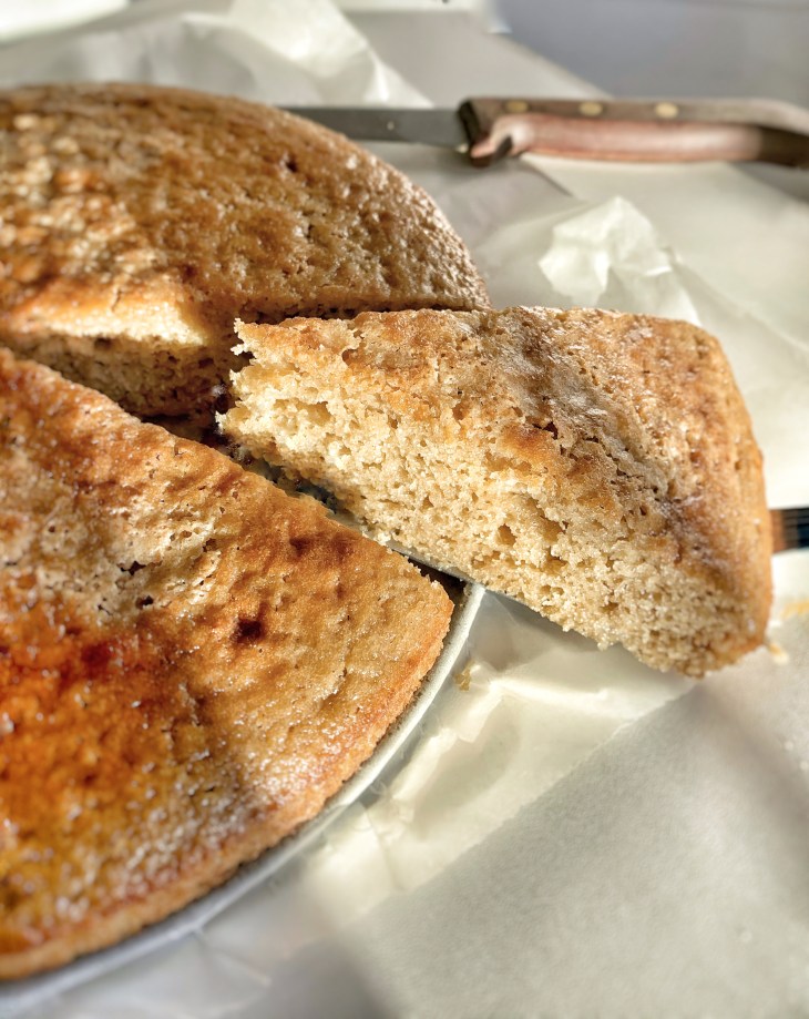 Versare immediatamente nello stampo (perché non appena il lievito viene a contatto con l’umidità, inizia a reagire). Opzionalmente, cospargere la parte superiore con un po ‘ di zucchero per aggiungere un lato croccante. Cuocere fino a quando la torta è dorata, circa 30-35 minuti. Far raffreddare prima di tagliare e gustare con del caffè, con della panna, con del gelato … insomma… sbizzarrirsi !