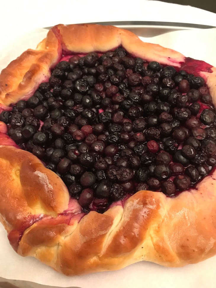 A questo punto, una volta pronto, stendere l’impasto al cardamomo con un mattarello per rivestire la base di una tortiera rotonda (l’impasto dovrà essere spesso circa 2,5 cm). Versare il ripieno di mirtilli, lasciando i 5 cm più esterni di pasta attorno al bordo senza ripieno, come se stessimo facendo una galette. Piegare delicatamente il bordo dell’impasto in modo che copra leggermente le bacche, come se fosse una pizza. Spennellare i bordi con uovo sbattuto.