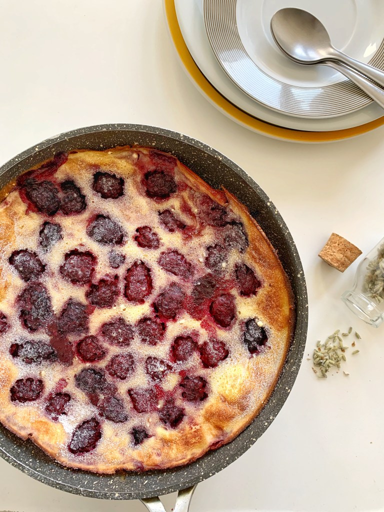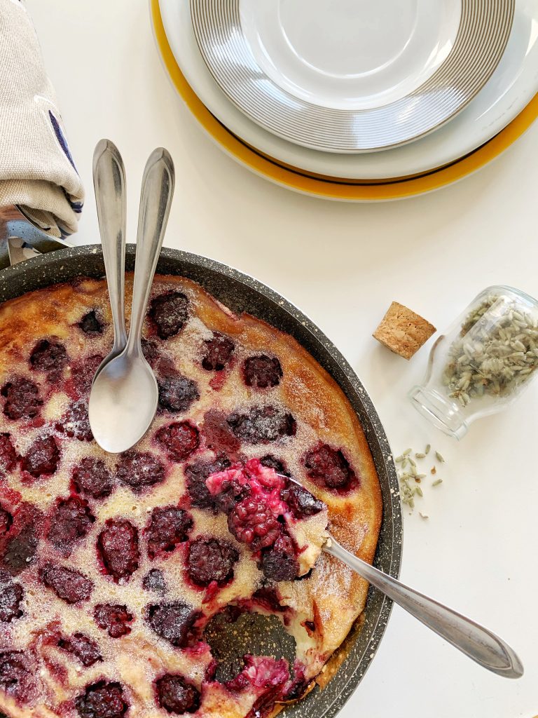 I puristi della culinaria grideranno: sia anátema! Ma io lo so. Si dice “Clafoutis”, il dolce francese, tipico della regione del Limousine (e non si tratta di macchine in questo caso… ) a metà strada tra torta, pudding e crêpe, quando è fatto solo con le ciliegie. Il resto è “flognarde”. Ma visto che “clafoutis” viene dall’occitano “clafotis”, che deriva a sua volta dal latino medievale e vuol dire “fissare”, “configgere”, “inchiodare”, allora io credo che con questa terminologia le more ci stanno bene! La ricetta, che viene da una proposta dal libro “The New Sugar and Spice”, di Samantha Senevirante, una foodblogger e foodwriter la cui scrittura mi piace moltissimo, è pura magia. Il succo di more è evidenziato dalla pastella morbida e semplicissima da preparare. Il profumo soave dei fiori di lavanda, regalo di Alice di @panelibrinuvole, lasciati brevemente in infusione nel latte tiepido, si intensifica in cottura esaltando la loro dolcezza floreale. Vi consiglio di consumarla calda, quando i bordi leggermente caramellati sono ancora un po ‘croccanti.