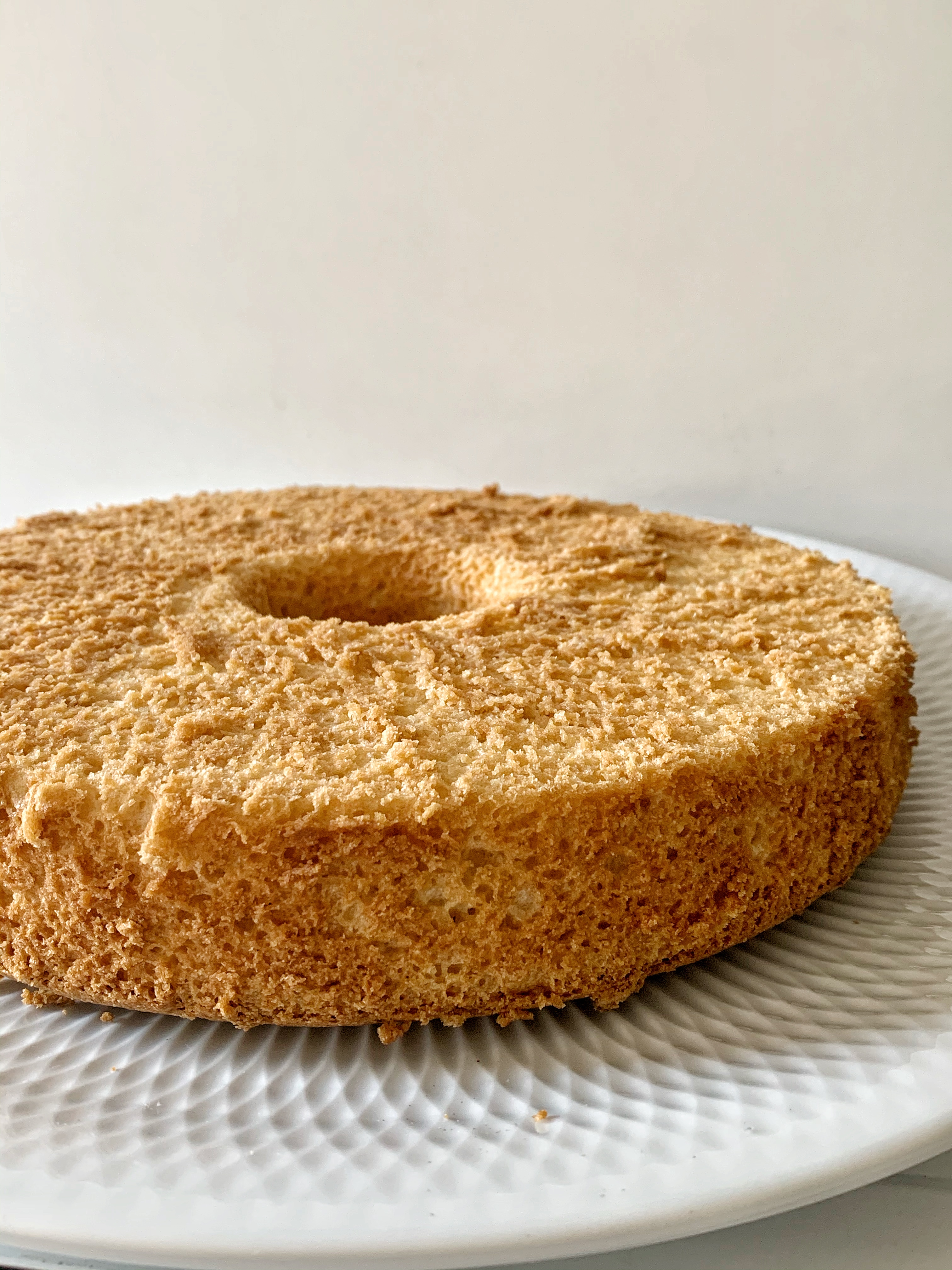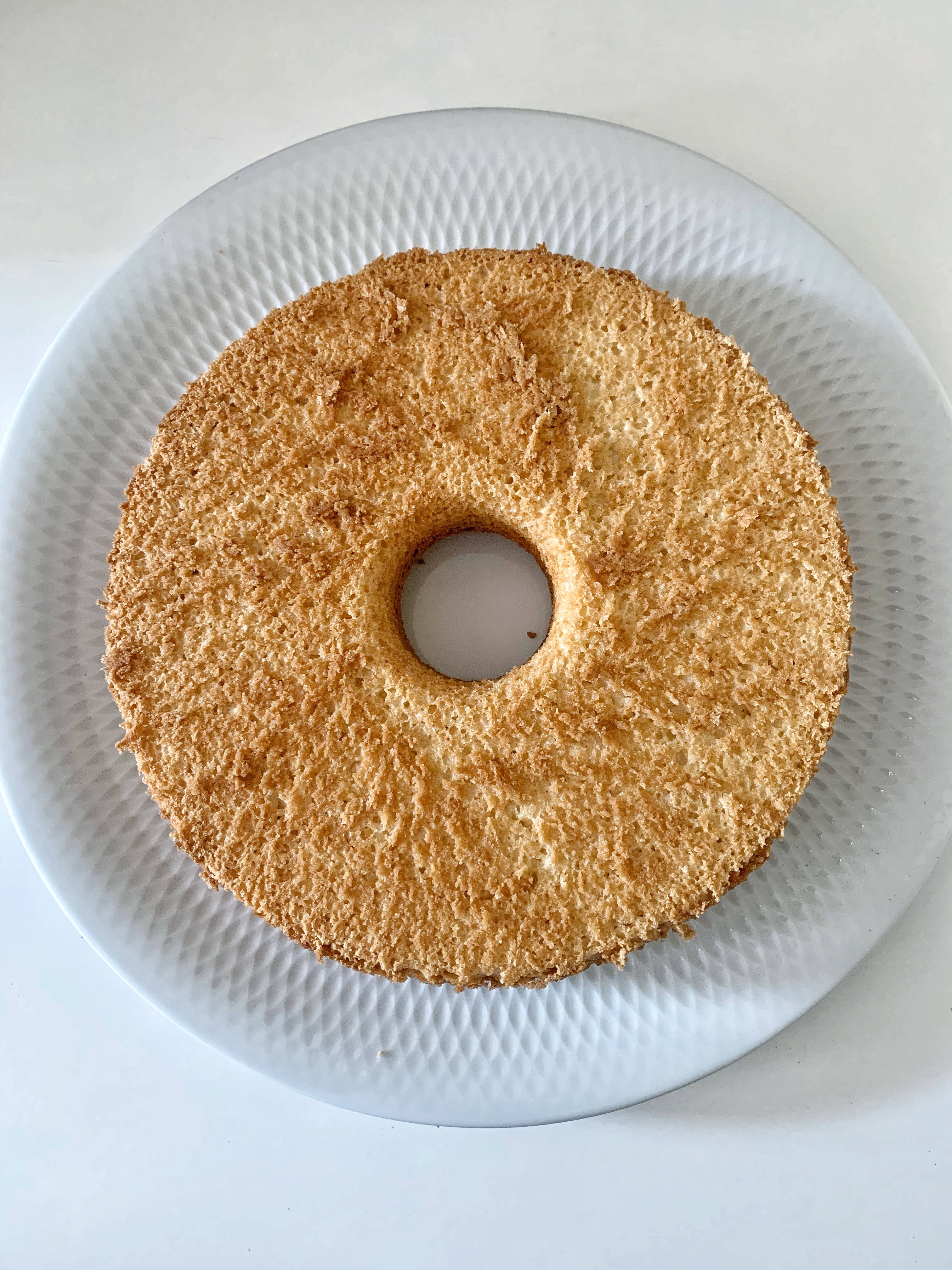 Versare l’impasto nello stampo NON UNTO da “angel cake” (per intenderci, quello da ciambella, col buco in mezzo, e dalle laterali rette e non svasate) e cuocere in forno preriscaldato a 170 gradi Celsius per circa 45 minuti. Sfornare. Capovolgere lo stampo e lasciare riposare finché non si raffredda completamente. Servire così, semplice semplice, oppure con della panna, yogurt, confettura, un gelatino alla vaniglia: insomma, combina con tutto.