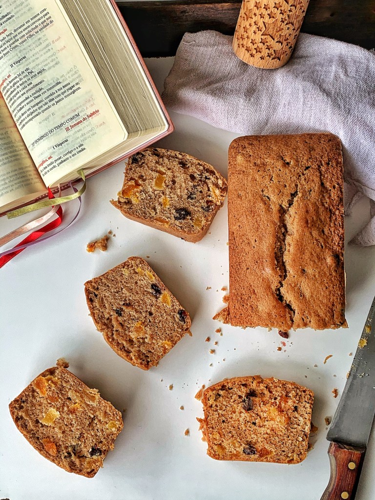 Questo plumcake vintage, abbastanza famoso nella cucina “religiosa” americana, coast-to-coast, soprattutto prima delle festività natalizie, tipica negli anni 1880 e 1890, altro non è che una torta speziata con una quantità enorme e deliziosa di frutta secca. La facevano in un grande connubio ecumenico presbiteriani, metodisti, luterani e cattolici. Ma la cosa più divertente è la storia. Era chiamata Torta delle Sacre Scritture, o Torta della Bibbia. Gli ingredienti non erano riportati normalmente, ma erano scritti come un indovinello. Si scriveva il versetto della Bibbia per poi cercare di sapere cosa c’era nella torta. Faccio un esempio: la ricetta richiede: “una tazza di Giudici 5:25″, cioè (andata a cercare!) si dovevano usare 226 g di burro. Da un lato, la catechesi domenicale, dall’altra si insegnava un po’ di abilità per fare dolci. Inoltre, spesso le donne della chiesa preparavano questi plumcake della Bibbia e poi vendevano fette di torta insieme a biglietti della lotteria per la raccolta di fondi. Di questi dolci ci sono piccole variazioni (sempre sull’uso e il tipo di frutta secca e di noci), ma dipende dalla Bibbia utilizzata. Mi sono preso la briga di cercare nella Bibbia italiana, ma le corrispondenze sono poche. Effettivamente, questa ricetta deriva dalla Bibbia anglosassone più tradizionale possibile (la versione del Re Giacomo). Siccome non c’è alcun riferimento biblico per il lievito chimico per dolci, lo si è aggiunto per farla più moderna.