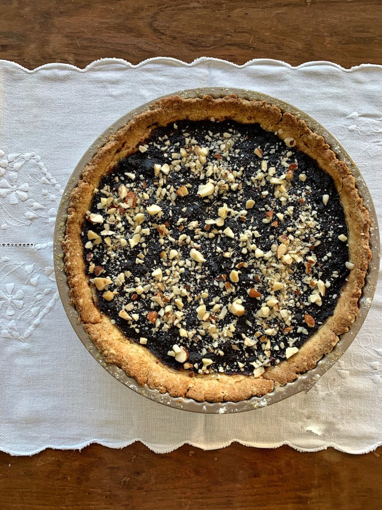 Ho preparato questa crostata con una marmellata di more fatta in casa da me medesimo… Buonissima. Tutto buonissimo. Frolla perfetta. Ma ho voluto apportare una variazione brasiliana…. Così ho spezzettato degli anacardi (castanha de cajú) e li ho disseminati… il contrasto tenuemente salato con il dolce della marmellata mi è sembrato perfetto al mio palato. Così non mi sono arrabbiato per il fatto che non sono ancora capace (e questo è la vera verità…) di far bene le strisce per la crostata…. Vi ho detto tutto, adesso però non mi bastonate….
