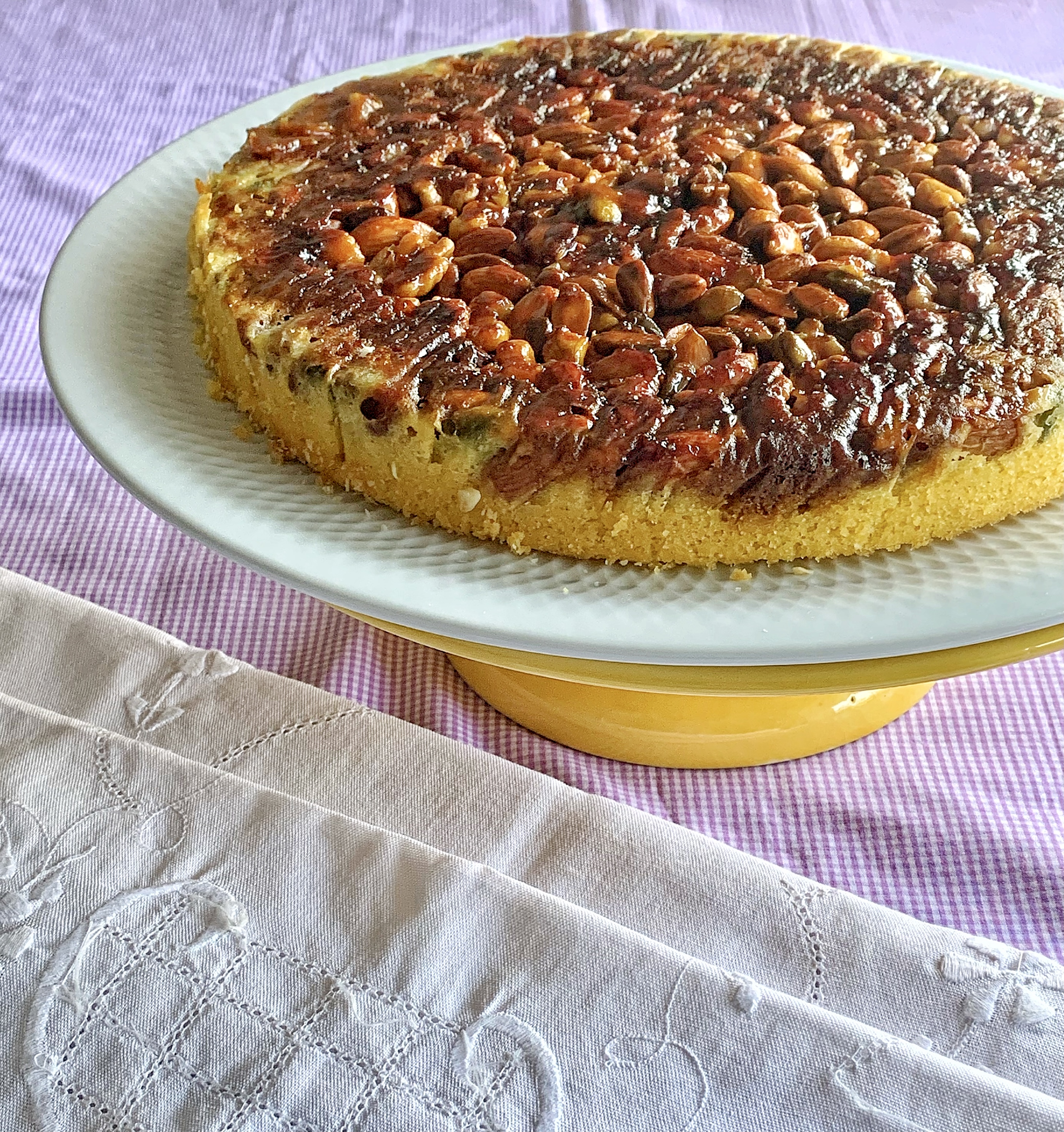 Appena prima di infornare, preriscaldare il forno a 180 gradi C. Togliere la pellicola trasparente dallo stampo rotondo e cuocere per 40 minuti, ruotando a metà del processo di cottura. La torta è pronta quando il centro è sodo al tatto e uno stecchino inserito al centro esce pulito dal centro della torta, e i bordi saranno dorati. Sfornare la torta e lasciarla raffreddare nella tortiera per circa 10 minuti. Far scorrere un coltello attorno ai bordi della torta per allentarla, quindi posizionare un piatto da portata sulla parte superiore della teglia e capovolgere la tortiera. Dare dei leggeri colpetti alla teglia per allentare la torta e finalmente rilasciare la tortiera. Lasciar raffreddare completamente la torta prima di staccare la carta forno dalla superficie dello strato di noci caramellate. Servire la torta a temperatura ambiente.
