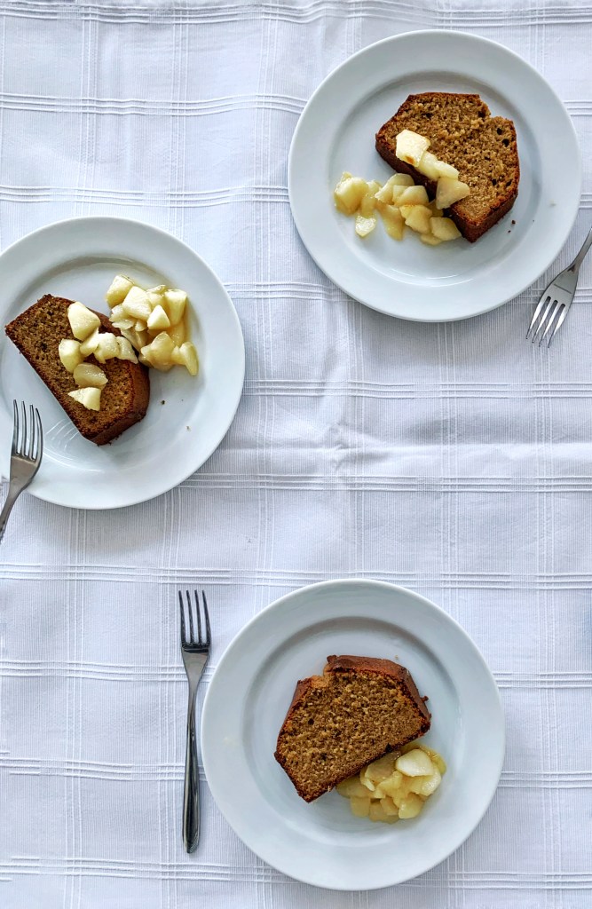 Pound Cake. Croce e delizia pensare al fatto che una libbra di ogni ingrediente serve a offrire un dolce che sa di casa, di famiglia, ma anche di storie di vita vissuta. Perché – tremate, tremate! – i pound cakes si facevano così: 453 g di tutto (uova, farina, burro e zucchero)! Erano cakes per battaglioni. Si facevano soprattutto nelle chiese americane. Le dame religiose le vendevano per le loro lotterie. Ma non erano mappazze, da buttare via. Chi sottovalutava era severamente punito! Perché i fedeli andavano al culto religioso solo per questi benedetti pound cakes! Sembra che il primo pound cake risalga al 1796, quando la signora americana Amelia Simmons pubblicò “American Cookery”, una raccolta di ricette inglesi adattate a palati nordamericani. Perché i pound cake, come i quattro-quarti, fanno parte della stessa famiglia (europea). Dopo la Simmons, una donna di colore (e qui ci vuole proprio: Black Lives Matter!) Malinda Russell, che gestiva una pasticceria nel Tennessee, lo trascrisse identico in un suo libro di cucina del 1866. Nel corso degli anni, i pound cakes sono cambiati, trasformati, modernizzati con alcune cose stranissime, tipo l’aggiunta della famosa 7-Up in uno di essi. Alcuni dicono che i pound cakes si cucinano in forno freddo, e non preriscaldato; altri dicono che va bene un forno basso. Qualunque sia la versione dei fatti, questa ricetta che vi presento oggi, dove, vi avviso, ho dimezzato le dosi per non andare dal medico domani, è tra le più tradizionali. Merita il premio. Deliziosa, per ogni momento di amicizia, attenzione a montare bene per aerare l’impasto. Le pere saltate allo zenzero rasentano il paradiso. Fidatevi. Vi porto con me in paradiso.