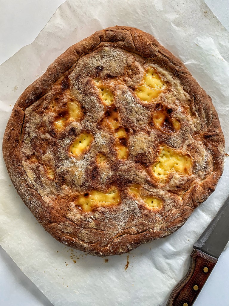 Vi lascio questa meravigliosa galette, una specialità della città medievale di Pérouges, vicino a Lione, fatta con una pasta brioche lievitata al limone, cosparsa di una generosa quantità di zucchero, cosparsa di burro e cotta in un forno molto caldo. Lo zucchero caramella e ogni boccone è una vera delizia. Si dice che sia un dolce che risale all’epoca medievale. Mi ha rianimato cucinarla, questa galette. Autentica e semplice nel gusto, esattamente quello che ci vuole per ora, senza troppe chiacchiere, o fronzoli.