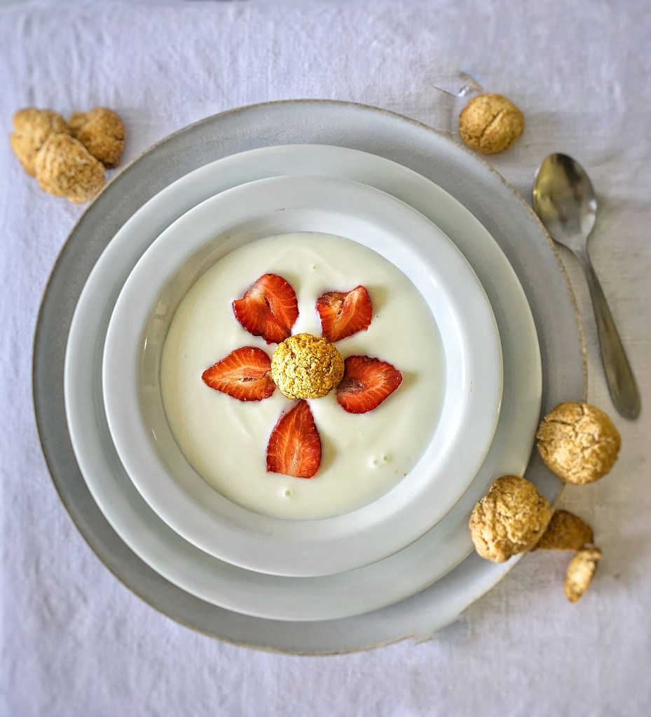 Questa “kodkskal” (non so se ci va qualche pallino sulla “a”… per la precisione) è danese e viene dall’immancabile libro di cucina scandinava che ho sul comodino, come una Bibbia, della carissima @bronteathome. Ho fatto pure i biscotti. Croccantissimi, buoni, burrosi, come piacciono a noi. I biscotti viziano più della zuppa. Metteteci frutta fresca come le fragole, come ho fatto io. Oppure pesche, ma che sia frutta colorata… spezzettate – o no – i biscotti del Paggio di Camera (questo sembra voglia dire Kammerjunker) e poi godetevi il panorama e mangiate e non ve ne pentirete…