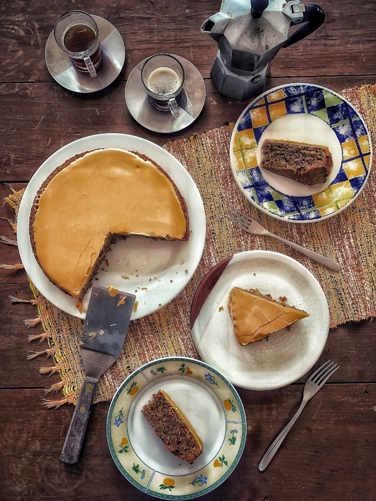 Aggiungere delicatamente la farina al composto, incorporandola bene ma con attenzione, quindi versare il composto nella tortiera foderata aiutandosi con una spatola di silicone. Lisciare uniformemente e delicatamente la parte superiore. Cuocere per 45-50 minuti, coprendo leggermente la parte superiore con un foglio per gli ultimi dieci. Sfornare e lasciar riposare una quindicina di minuti prima di sformare su una gratella a raffreddare. Staccare delicatamente la carta dal fondo e lascia raffreddare la torta. Mescolare lo zucchero a velo e il caffè fino ad ottenere un composto omogeneo, quindi versare sulla torta e lasciare riposare per un’ora circa. La delizia sia con voi!