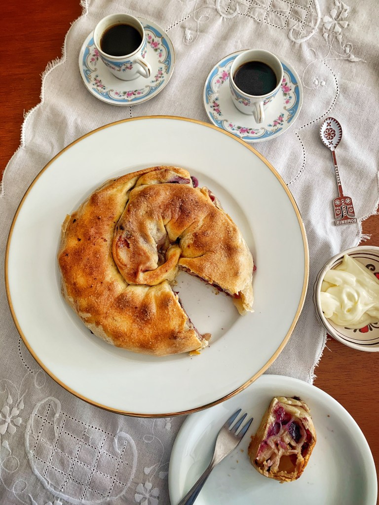 Oggi vi presento una torta di mele e mirtilli, giusto restando in tema “meloso”, che viene dal libro bellissimo di @irina.r.georgescu, “Carpathia”, dedicato alla cucina romena e dei Carpazi. È una cucina ricca di storie e tradizioni che si intrecciano con altri paesi. E questo dolce, in modo speciale, ha un nome molto originale. Si chiama “învârtită”, che è anche il titolo di una danza tradizionale rumena. Le coppie mettono le braccia sulle spalle e si girano con eleganza, le donne agitano le loro bellissime gonne a pieghe e scandiscono il ritmo con un passo veloce. Fa parte della vita dei villaggio rumeni nei giorni festivi o la domenica dopo la chiesa quando la gente ama giocare, ballare e mangiare del buon cibo. Sono rimasto incantato da questa storia.
