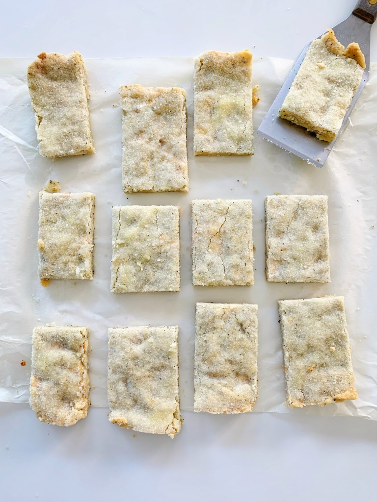 Preriscaldare il forno a 160ºC. Imburrare e foderare una teglia quadrata da 20 cm con carta da forno, lasciando una leggera sporgenza sui lati. Setacciare insieme la farina, la farina di riso e il sale, quindi incorporare la camomilla. Nella ciotola di una planetaria munita di attacco a paletta, montare il burro a velocità media fino a ottenere un composto omogeneo, circa un minuto. Aggiungere lo zucchero e sbattere fino a ottenere un composto chiaro e cremoso, quindi incorporare la vaniglia e la scorza. Abbassare la velocità del mixer e aggiungere gli ingredienti secchi. Montare fino a quando non inizia a formarsi un impasto morbido (dovrebbero esserci ancora delle piccole “zone” di farina non lavorate dappertutto), quindi incorporare il cioccolato. Versare nella teglia preparata, aiutandosi con il dorso di un cucchiaio per pressare in uno strato uniforme. Spolverizzare la superficie con un po’ di zucchero in più. Potete abbondare a questo punto, se preferite una crosta più consistente. Cuocere per 30-35 minuti, fino a doratura. Sfornare e utilizzare subito un coltello affilato per inciderlo in nove pezzi o altra quantità se li taglierete rettangolari. Fare raffreddare prima di sfornare e servire.