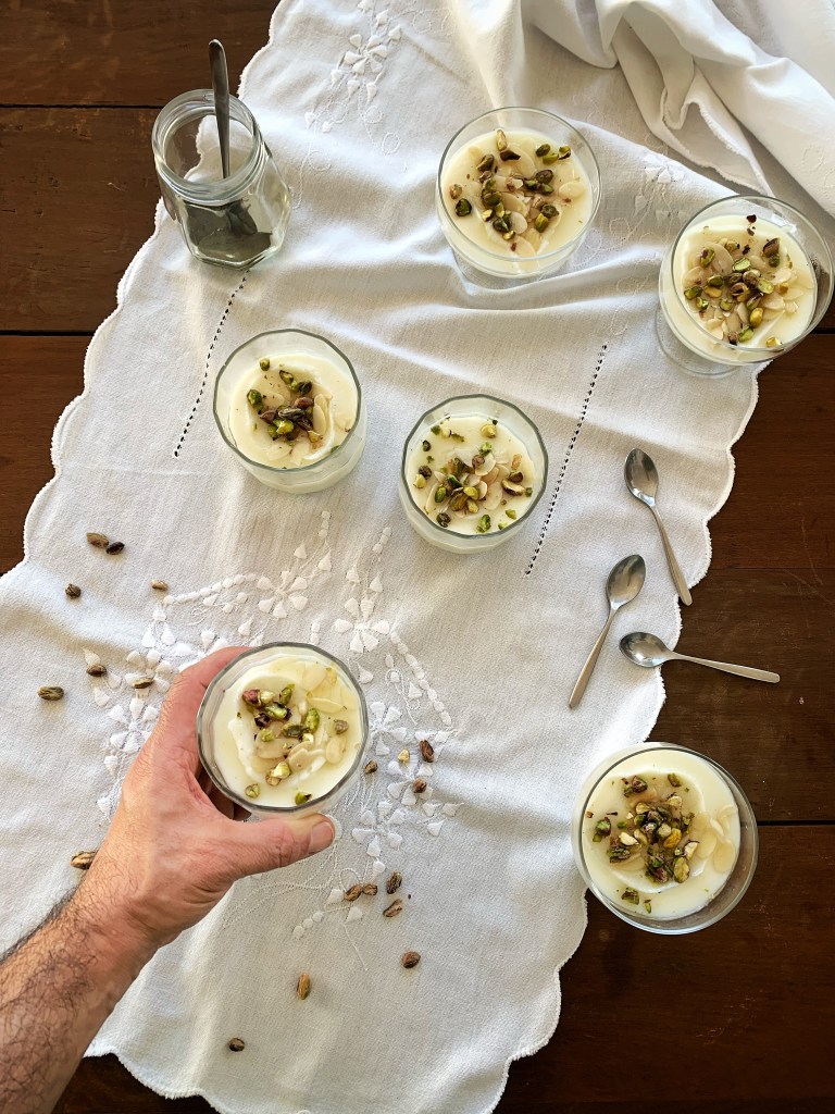 Questo “Muhallabieh”, che mi ha fatto tornare in mente momenti della mia bella infanzia, è un semplicissimo budino di latte. Il che potrebbe non promettente nulla di grandioso. Ma voi provatelo. Se vi piace la panna cotta, allora questo dolce al cucchiaio fa per voi. Lo sciroppo di alloro, una genialità di Ottolenghi e di Sami Tamimi, che accompagna questa ricetta esalta il sapore e fa festa, ricordi belli dell’infanzia, e altre cose buone.