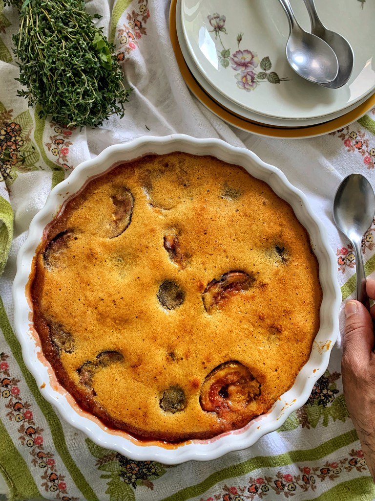 Immaginatevi questa scenetta. Vado al supermercato per fare una spesa, diciamo, consueta. Getto un’occhiata sulla frutta: mele onnipresenti, le pere, il mango, la papaya, il cocco, le banane… ad un tratto i miei occhi si illuminano. Vedo un vassoio di fichi – stupendi, e pure a buon prezzo. Come dire: i fichi mi stavano aspettando. Mi fiondo alla casa praticamente solo con quelli. Altrettanto velocemente rientro a casa. Sembro Cappuccetto Rosso felice andando dalla nonna con le focacce. Ho già in mente cosa fare. Un clafoutis di fichi e timo, di Ottolenghi, che mi seduce quando sfoglio il suo bellissimo libro “Simple”. Fatto in un battibaleno. Mangiato pure. Infatti, la ricetta prevede che sia per solo 4 commensali…. E potrebbe sembrare molto…, ma è così leggero e soffice che si rimarrà molto sorpresi a mangiarselo tutto da soli. Certo, dovete accendere il forno, e so che sta facendo un caldo infernale da voi. Ma i fichi arrivano a settembre in Italia. Salvate la ricetta e non ve ne pentirete!!!