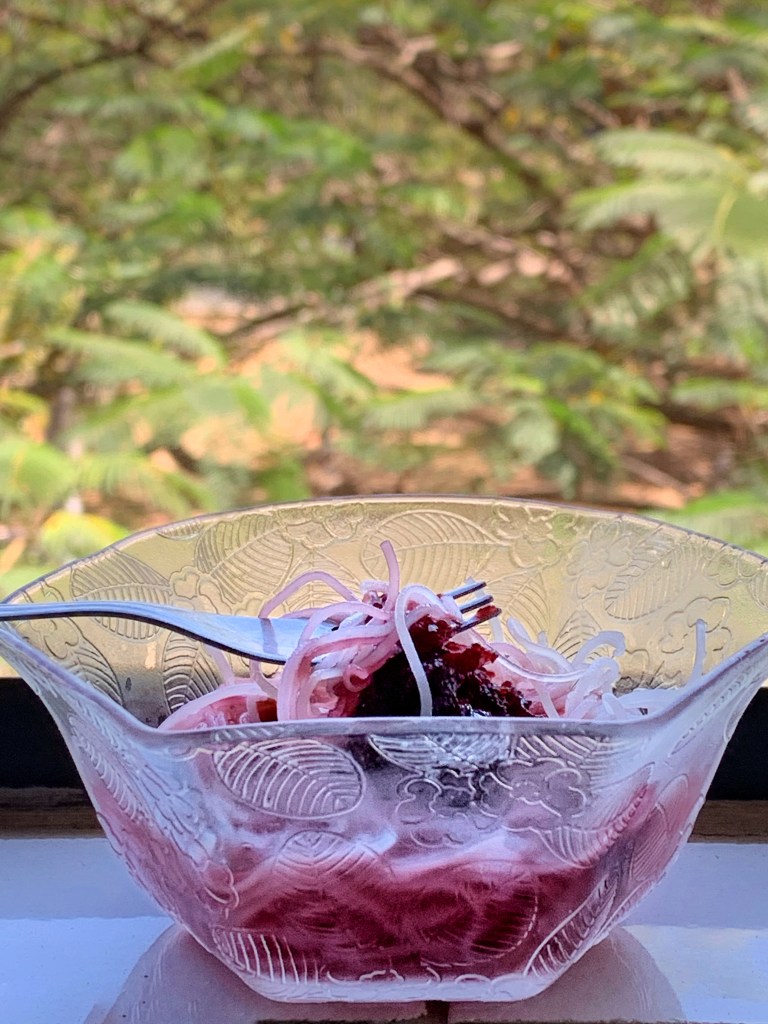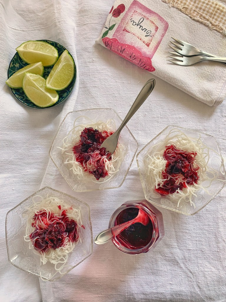 Questo che vi propongo oggi è un Faloodeh, un popolare dessert persiano a base di vermicelli freddi mescolati con granita o gelato, ed è disponibile in molte forme e gusti diversi. Potrebbe sembrare un po’ strano a chi, appunto, storce il naso di fronte a delle tagliatelle per dessert, ma come scrivono Ottolenghi, Noor Murad & co., è un dolce perfetto per l’estate, freddo, dolce, rinfrescante, insomma proprio quello che serve in una calda giornata estiva. È anche super eccentrico e divertente da realizzare (e da guardare)! Una parte si può preparare il giorno prima (tipo lo sciroppo, le tagliatelle cotte e la granita al limone con menta). Invece dello sciroppo di melograno, io ho personalizzato la ricetta facendo una purea di ciliegie aromatizzata all’essenza di mandorle. Vi invito a lasciarvi provocare da questo dessert “funky” !!! E se proprio non vi ho convinto, insisto e dimezzate la dose… Super buono, super divertente, super cool!!!