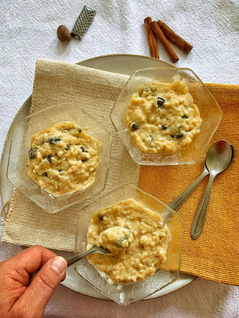 Ed ecco che questo riso dolce riscalda i cuori. Una ricetta stupenda della grande Claudia Roden, dal suo classicissimo “The Book of Jewish Food”. È quasi magico, oltre che il più buon risolatte mai provato, per me. Se lo mangiate caldo ha una consistenza cremosissima; se lo preferite da freddo, sembrerà una torta. La Roden propone alcune variazioni molto allettanti in questa ricetta mitteleuropea, come infornare il riso, dargli un aspetto da soufflé, eccetera. Ho scelto l’aggiunta di uva passa, impaziente, perché non resistevo alla voglia di un buon riso dolce.