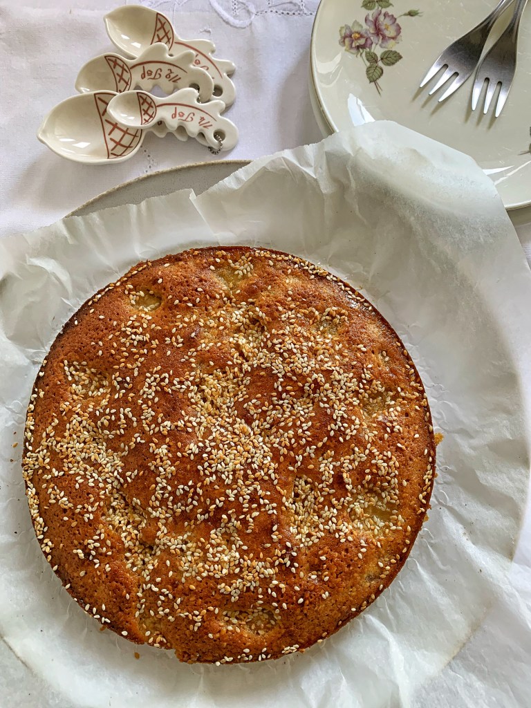 Cuocere per 25 minuti, ruotando la teglia a metà in modo che la torta si colori uniformemente. Dopo 25 minuti, irrorare con lo sciroppo d’acero, cospargere con 1 cucchiaino di semi di sesamo e rimettere in forno per 10 minuti, fino a quando la superficie è bella dorata e i bordi della torta non saranno divenuti croccanti.