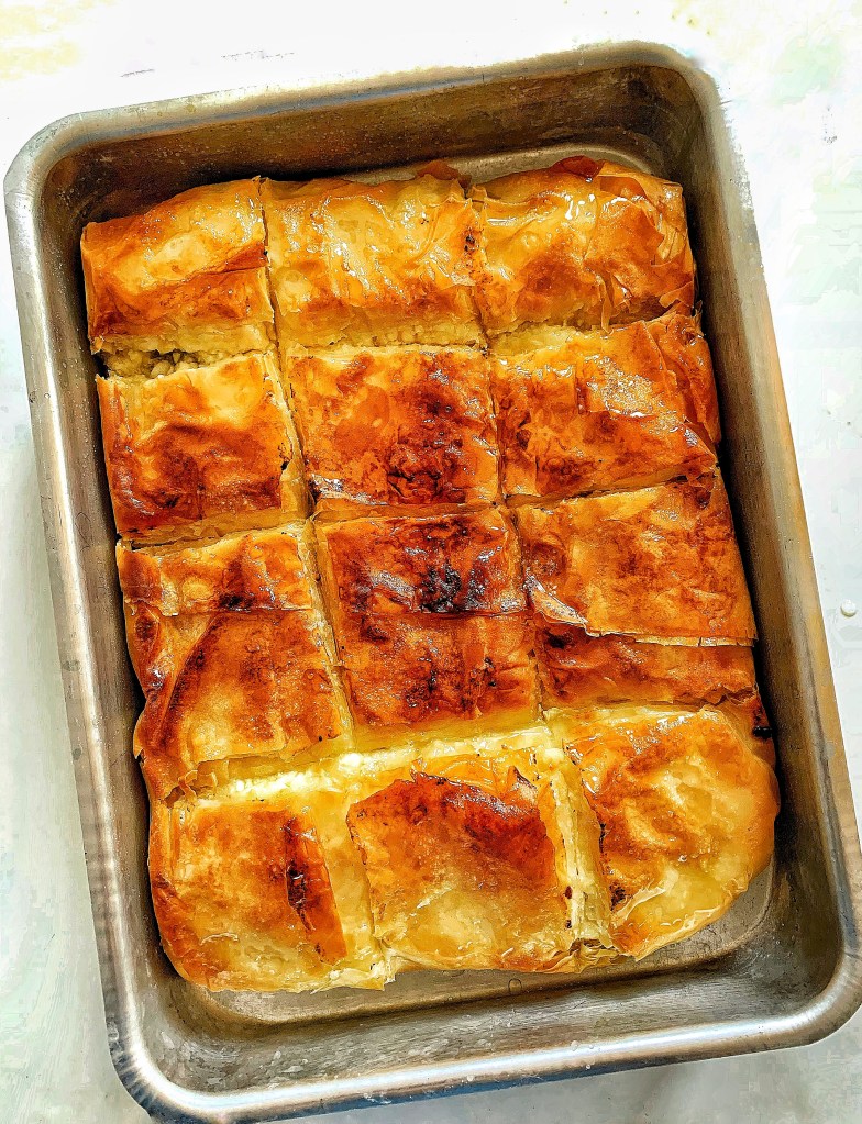 Note: Il mutabbaq è insolito ma assolutamente delizioso. Può essere preparato in anticipo, conservato in frigorifero e poi cotto in forno quando siamo pronti a servire. Se lo si desidera, aggiungete un paio di gocce di acqua di fiori d’arancio allo sciroppo. Un ripieno alternativo ma comune che si può usare consiste in noci tritate (200 g), zucchero semolato (50 g), cannella (1 cucchiaino) e burro fuso non salato (3 cucchiai), tutti mescolati insieme.