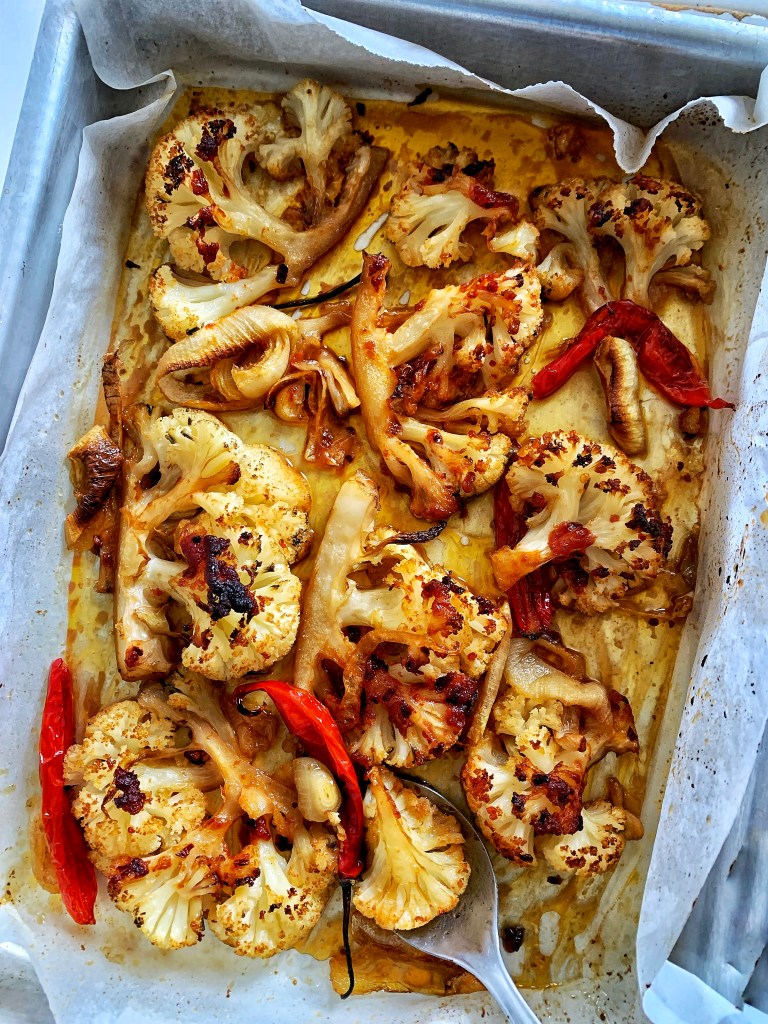 - Mettere i quarti di cavolfiore, le cipolle e i peperoncini sulla teglia preparata e versa sopra il burro di peperoncino. Mescolare accuratamente per assicurarsi che tutto sia molto ben ricoperto. Disporre i quarti di cavolfiore in modo che siano il più distanziati possibile; uno dei lati tagliati di ogni quarto dovrebbe essere rivolto verso il basso, in modo che le foglie siano esposte. Arrostire per 30 minuti, irrorare bene, quindi abbassare la temperatura a 190°C e continuare ad arrostire per altri 35-40 minuti, imbastendo due volte, finché il cavolfiore non sarà ben dorato e le foglie croccanti.
