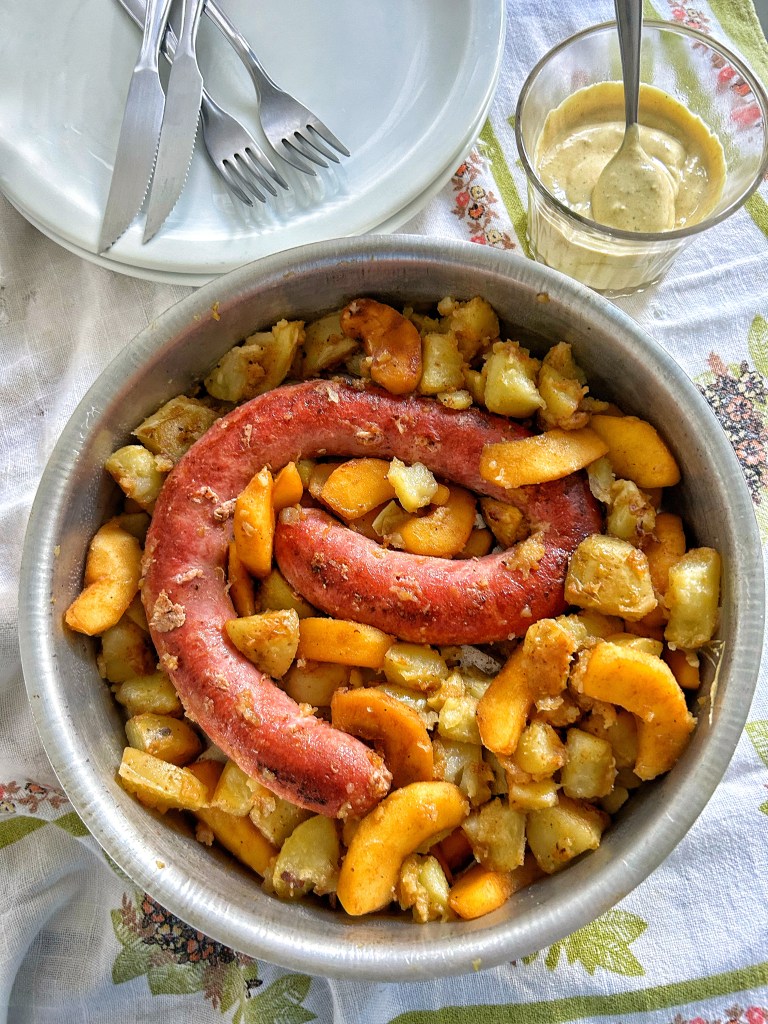 Dopo circa un minuto, mescolare la senape e la panna nella pentola. Aggiungere le spezie e condire con sale e pepe. Versare un po’ di salsa in ogni piatto e metterci sopra le salsicce, le patate e le mele.