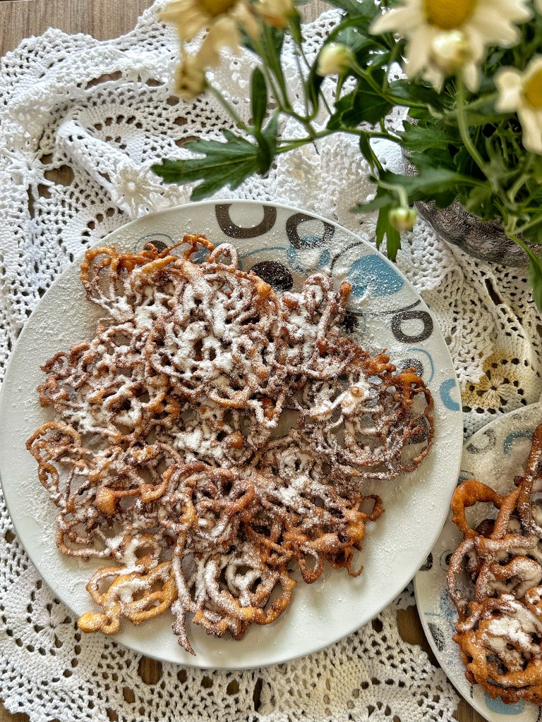 Il dolcetto fritto è una delizia, facilissimo da preparare, tranne che per il fatto che dovete avere un sac-à-poche o inventarvene uno per fare i suoi ghirigori tipici. Abbondate con lo zucchero a velo, mangiate e bevete! Meglio consumare subito dopo la frittura.