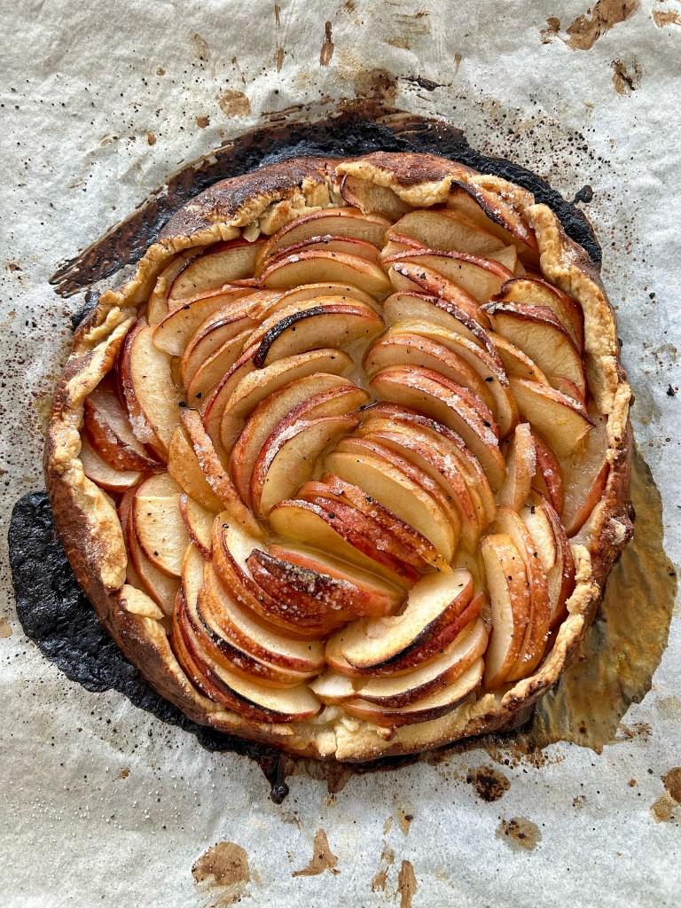 - Piegare i bordi dell’impasto sopra le mele e spennellare l’impasto con il latticello seguito dai restanti 2 cucchiai di zucchero. Cospargere il tutto con sale marino a scaglie e pepe nero. Ci sta benissimo! Non lo evitate! Trasferire la “tart” crostata sulla carta forno e cuocere fino a quando l’intera crosta diventa molto dorata (anche di più!) e le mele sono tenere e cotte, da 45 a 50 minuti. Lasciare raffreddare prima di affettare e mangiare in qualsiasi modo che ti sembri casuale e appropriato.
