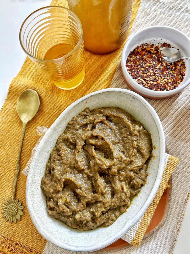 Ottolenghi dice che, dopo tanti anni passati a cucinare e scrivere ricette, rimane ancora stupito ogni volta che nota come anche la minima variazione nella tecnica possa fare una differenza spettacolare. Questa salsa di melanzane di Trinidad, servita con roti o naan, che non è poi così diverso dal baba ghanoush o da altre insalate di melanzane mediorientali, è BUONISSIMA. Qui la variazione sta nell’usod di olio caldo aromatizzato con cipolla e una vigorosa frustata per ottenere una meravigliosa cremosità. Per renderla ancora più delicato, omettete l’aglio e usate meno peperoncino, se vi piace. Va benissimo da servire come salsa, con il pane o come condimento accanto a un bell’agnello arrosto, a un pollo o a della zucca. Crea dipendenza. Siete avvisati.