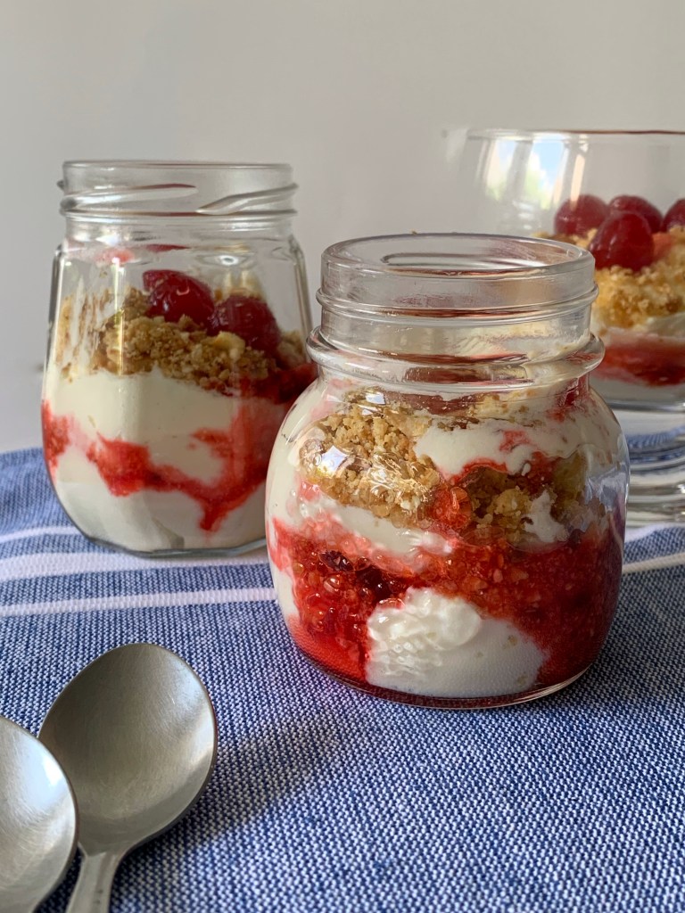 Vi sono rimaste ancora delle ciliegie? Fresche o congelate? Allora non passate oltre a questa fantastica ricetta di Ottolenghi, quel genio, quel mito! Da presentare bellamente in un bicchiere speciale… anche da Martini, se volete…. C’è solo un piccolo sacrificio da fare… accendere il forno per 12 minuti…. Ma poi è di una facilità estrema…. E non vi dico la bontà… se vi piace l’agrodolce… allora è gioia allo stato puro. Tutto si prepara con semplicità e può essere preparato con largo anticipo. Non c’è nulla da fare il giorno in cui si serve, a parte un po’ di assemblaggio informale. La cheesecake (che si conserva per 3 giorni) e la composta (che si conserva per 5 giorni) devono essere conservate in frigorifero, mentre il crumble (che si conserva per una settimana circa) deve essere conservato in un contenitore ermetico a temperatura ambiente. La composta e il crumble sono ottimi anche per la prima colazione, se vi avanzano o se volete prepararne altri, serviti con yogurt greco.