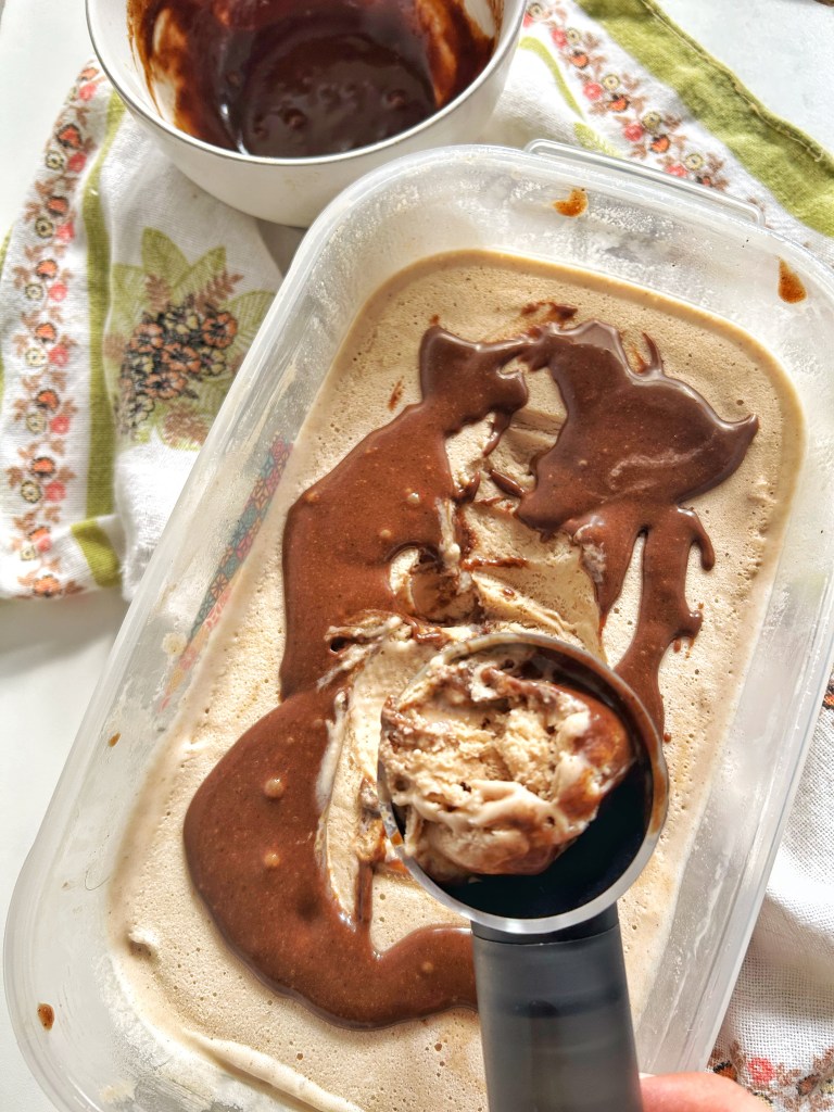 Servire il gelato con le scaglie di cocco cosparse sopra e la restante salsa fudge a parte. La consistenza è migliore dopo circa 4 ore di congelamento. Una volta congelato, scongelare in frigorifero per 15-20 minuti prima di servire.