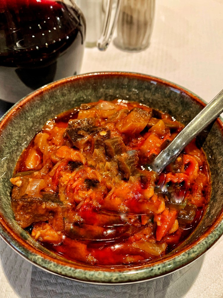 Si potrebbe dire che questo post è un “déjà vu”. Per alcune piccole ragioni che adesso spiegherò. Questo fine settimana avevo in mente di fare qualcosa di gustoso che ricordasse la mia Sicilia. Trovo allora Francesca @francik01 che propone una Story con un “adjapsandali”, una ricetta georgiana che ricorda molto la caponata nostrana, e che, scopro, ha gusti e amici in comune… come dire, facendo mie le sue parole, “che meraviglia gli incontri che ci riserva il destino”. Ora, però, ci sono ricette che non faccio perché non posso imitare o riprodurre quelle meravigliose di mia mamma, come appunto la suddetta caponata, perché la sua è divina, irripetibile e unica, e su questo tema ho già scritto quando ho preparato il Serdakh dell’Azerbaijan… Ecco, dunque, la mia variazione, il mio omaggio, ecco la “caponata” georgiana.