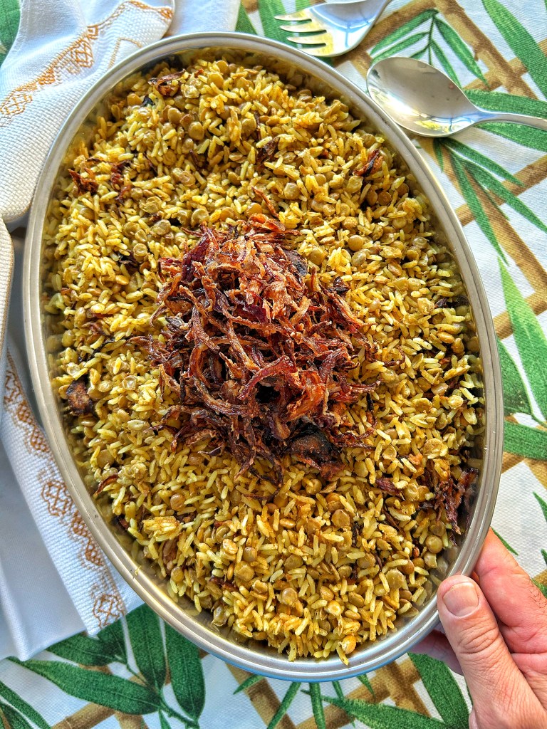 La “Mejadra”, che oggi preparo per #aroundtheworldin80dishes, che questo mese viaggia fino al Libano, grazie a super hosts come Claire @thecultiveater e Manu @manumunson, è un piatto che ha origini bibliche. Nientedimeno! Lo chiamano “il preferito di Esaù”. A quanto pare, nel libro di Genesi, si narra che Esaù, dal pelo rosso, abilissimo nella caccia, fosse tornato a casa, sfinito e affamato. Suo fratello gemello Giacobbe aveva cotto una semplice minestra di lenticchie rosse (appunto, tutto in tono). Ora, questa zuppa doveva essere non buona, ma di più!… perché quando Esau chiede a Giacobbe di lasciargliene mangiare un po’, Giacobbe lo ricatta chiedendogli che, in cambio, gli sia venduta la primogenitura. E così fu. Manco fosse riso dorato con lenticchie dorate….
