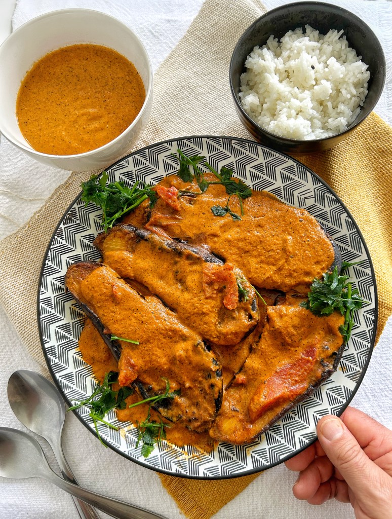 Per le ultime melanzane dell’anno, come promesso, ecco una ricetta di Nigel Slater, tratta da “Greenfeast. Autumn, Winter” (2019). Praticamente è una specie di gustosissimo curry di melanzane, leggermente piccante, che potrebbe andare benissimo se volete fuggire dalle solite (ma sempre benvenute) lasagne e pappardelle abbondanti di ragù, e volete stupire amici e parenti (disposti al gioco delle novità domenicali in cucina).