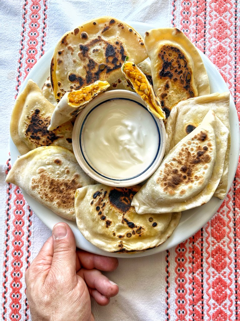 Invece la storia di queste deliziose focaccine sottili sottili farcite con diversi ripieni – erbe, carne, zucca e melograno (le opzioni possono essere infinite), raccontata da Olia Hercules nel suo bellissimo libro “Kaukasis” mi ha fatto rimbalzare alla Sicilia della mia infanzia e adolescenza. Olia ricorda una donna con un vestito estivo a fiori e una fascia per capelli che prepara i “qutabs” e passa le focacce fresche e calde, attraverso una finestra semichiusa. Ecco, stessa immagine: mia nonna mi chiedeva di andare a prendere il pane da una sua cugina che lo infornava a casa. Andavo e lei me lo consegnava caldissimo da una finestra semichiusa. Che bello! Un salto indietro nel tempo. La cucina fa anche questo: nostalgia, avventura, ricordo, qualcosa che non si dimentica mai così facilmente.