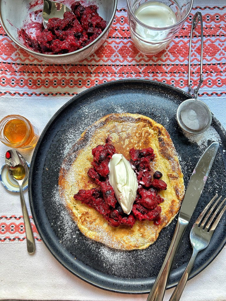 Invece la frittata (polacca) di oggi, che viene dal bellissimo libro “Polska”, di Zuza Zak, è una “omlet biszkoptowy”, cioè una omelette “biscottosa” e meringata, quasi un mini pan di Spagna, che si fa in fretta ed è buonissima per una colazione dolce per via dei frutti di bosco (utilizzate quelli di stagione o quelli disponibili localmente). Se vi avanzano degli albumi, aggiungetene uno (o anche due) alla ricetta per ottenere una consistenza ancora più soffice. Per ogni albume in più aggiungete mezzo cucchiaio di farina. Mangiatela subito, tiepida, affinché non perda la sua soffice consistenza! Buona domenica!