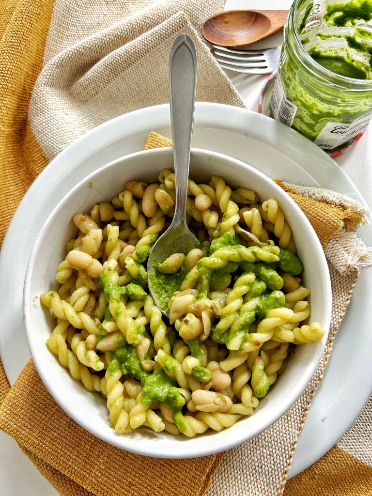 - Quando la pasta è pronto, mescolare il succo di limone e metà del pesto alla pasta e trasferire il tutto in una grande ciotola poco profonda o in un piatto con il bordo (in alternativa, servirla direttamente dalla padella). Cospargere con circa metà dell’halloumi, se usato, e servire l’altro halloumi e il pesto rimasto nelle ciotole a fianco.
