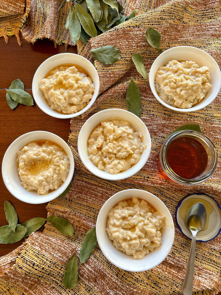 In una casseruola grande, unire il latte, il riso, lo zucchero e il sale. Aggiungere 3 foglie di alloro fresche o 2 secche al posto del baccello di vaniglia e quattro strisce di scorza d’arancia larghe 3 cm. Cuocete a fuoco basso e a fuoco lento, mescolando spesso con una spatola di gomma resistente al calore per assicurarvi che il riso non si attacchi al fondo. All’inizio il composto sarà piuttosto liquido, ma man mano che si addensa sarà necessario essere vigili e mescolare quasi costantemente. Quando il latte è stato assorbito dal riso e il budino assomiglia a un risotto sciolto, il che richiede circa 45 minuti, togliete il tegame dal fuoco. Rimuovere le foglie di alloro e le strisce di scorza d’arancia prima di servire, quindi mescolare l’uvetta e l’eventuale liquido di ammollo non assorbito. Servire caldo o a temperatura ambiente.