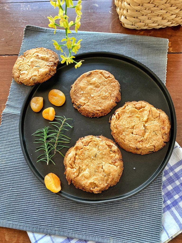 Mescolare insieme la farina, l’avena, il rosmarino, il lievito e il sale. Nella ciotola di una planetaria, montare per 3 minuti il burro e lo zucchero a velocità media fino ad ottenere una crema. Unire la vaniglia e la scorza d’arancia. Interrompere di montare per raschiare il fondo e i lati della ciotola, quindi abbassare la velocità. Incorporare gli ingredienti secchi e sbattere fino a quando non saranno quasi amalgamati. Deve risultare un composto un po’ farinoso. Unire il cioccolato e le albicocche. Fate raffreddare per circa mezz’ora almeno in modo tale che si possa rassodare bene il composto. Nel frattempo, preriscaldare il forno a 180°C e disporre le griglie nel punto più basso del fornoFoderare due grandi teglie con carta da forno. Rovesciare l’impasto su un piano di lavoro leggermente infarinato.Usare le mani per spianare l’impasto a circa 2,5 cm di spessore. Usando un tagliabiscotti rotondo da 6 cm ritagliare i biscotti. NBe dovreste ottenere 8 belli grandi. Disporre i biscotti sulle teglie, posizionandoli a pochi centimetri di distanza e cospargerli con il sale.Cuocere per 16-18 minuti, alternando le teglie a metà cottura fino a quando i biscuits non saranno ben dorati.
