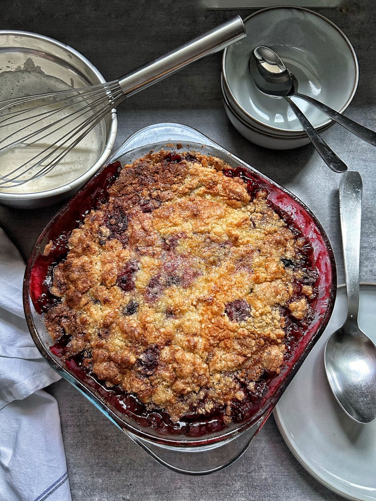 Non riesco a credere che ci sia qualcuno nel mondo gastronomico che non sappia chi sia Nigella, Nigella Lawson. Ho tutto i libri. Vorrei fare tutte le ricette. E so che c’è un foodblogger che si è prefisso questo obiettivo e giorno per giorno pubblica da anni una ricetta della Divina. Ho cominciato a fare i dolci – in modo serio e con gusto – giustamente grazie a lei. “Nigella Express” (2007), da cui è tratto questo “crisp”, per esempio è un libro mitico. Belle ricette, facili, ad effetto, e tutte, come dice il titolo, rapidissime, “express”, appunto. Tra chi scrive di cucina, Nigella è speciale. Per la sua scrittura originale, accattivante. Tra chi propone video su YouTube lei è la più seduttrice e il suo Posh English è veramente impeccabile e lo si vorrebbe imitare, come Lady Violet di “Downton Abbey”. Donna dalla forte personalità, incisiva, molto prorompente, in tanti sensi. Basta vedere. Recentemente ho riletto e rifatto ricette da “Nigellissima”, il libro sulla cucina italiana, che è stato anche un po’ criticato. Mi sembra ancora oggi un libro geniale. Scritto da chi ha “vissuto” la cucina italiana dal vivo. È stata in Toscana per un tempo. Poi bisogna fare i conti con le quantità di burro e zucchero, ma la vita è breve ed è bene goderla. Vi consiglio subito questo “crisp” alle more (ma che potete fare anche con un mix di frutti di bosco): cercate le more o altre bacche surgelate. Ho la fortuna di avere un negozio fornitissimo vicino casa qui a Parigi e avere frutta surgelata di ottima qualità fa sempre venire tanta voglia di fare dolcetti, marmellatine, composte… basta, ho l’acquolina in bocca….