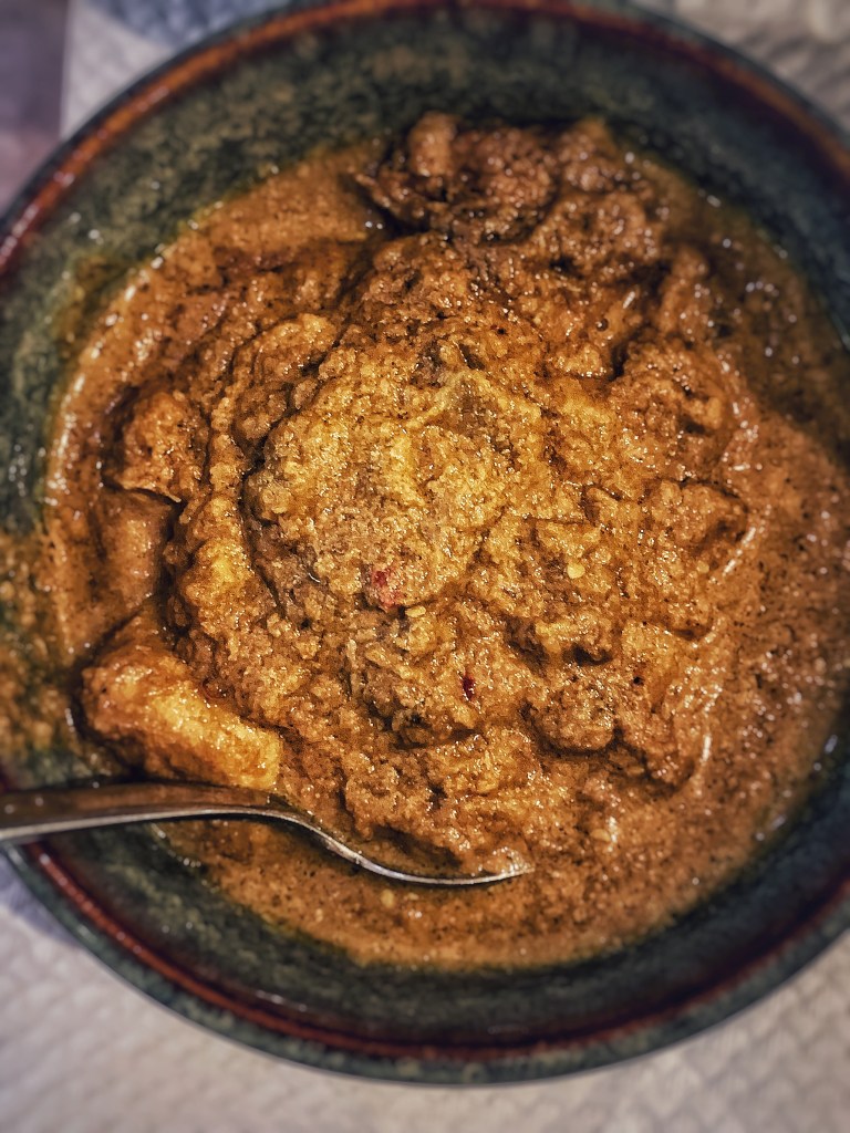 Il “kharcho” è un sostanzioso stufato della Georgia. Mi ricorda un episodio della mia infanzia. Per la festa “grande” di San Biagio, nel villaggio dei miei genitori, a fine luglio, passavo una settimana da solo con mia nonna. Erano i miei primi viaggi da autonomo. Mia nonna preparava per me le cose più deliziose possibili: pane caldo, fatto in casa, cosparso di zucchero o con olio, patatine fritte, pesche fredde da frigorifero che sembravano un gelato, e poi arrivavano i miei cugini e mio fratello e si mangiava uno stufato del sabato di San Biagio, la cui salsa era così buona da mangiarla con il pane, da sola! Poi però il pranzo era finito, perché non si aveva più fame…. Il “kharcho” mi ricorda tutto questo. La versione originale del “kharcho”, con quella salsa alle noci assolutamente divina, è sempre stata fatta con il pollo, ma da qualche tempo si usa la carne di manzo e, poiché in Georgia la versione di manzo è considerata migliore, è diventata la carne preferita per questo piatto. Si può servire con la polenta (in georgiano si chiama “gomi”), oppure con riso abbondante o pane “come si piovesse”.