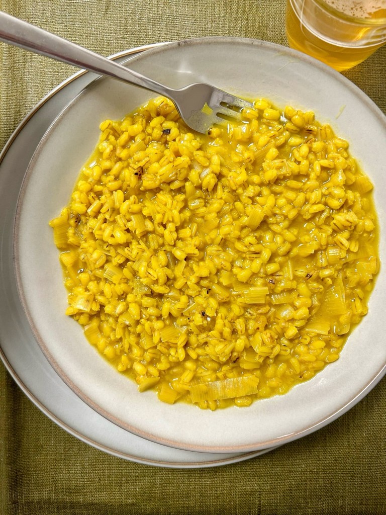 Stamattina mi sono svegliato con fame di cose salate. Sono forse impazzito? Qualcosa sotto sopra? Piovono polpette dal cielo? Fatto sta che ho sognato riso… haha… E invece di fare colazione, ho preso solo un caffè e poi, pochi minuti fa, mi sono dedicato al brunch… Nigella chiama questo risotto, ma fatto con l’orzo perlato, un “orzotto”. Lei lo propone come un accompagnamento amidaceo a un pollo arrosto o a un bel piatto di spezzatino do polpette (appunto). Io l’ho mangiato appena adesso, caldo caldo, all’italiana… come primo piatto. Aumentatene le dosi se volete servirlo per più persone. Da solo, mi sono fatto una scorpacciata. È incredibilmente semplice da preparare, poiché, a differenza del risotto, non si mescola quasi nulla, e si può fare facilmente in anticipo. Al momento di riscaldarlo, potreste aggiungere un po’ di liquido prima e, magari, un paio di cucchiai di mascarpone. Che darà una consistenza più cremosa. I chicchi d’orzo, impregnati di zafferano, trasudano solarità. Sono molto soddisfatto. L’orzo perlato è un cereale integrale e una ricca fonte di fibre, molibdeno, manganese e selenio; contiene inoltre buone quantità di rame, vitamina B1, cromo, fosforo, magnesio e niacina. Il suo consumo aumenta anche il numero di batteri intestinali benefici. Che volete di più per una cucina benefica e gustosa ?
