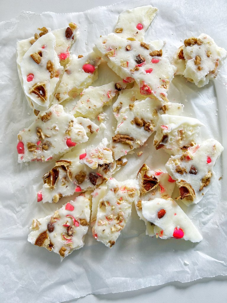 Raffreddare fino a quando non si induriscono, 30 minuti almeno (e volendo, si possono anche mettere in freezer se si ha fretta di mangiarli). Rompere in pezzi per servire. Potete raddoppiare o triplicare la dose perché il cioccolato bianco si conserva freddo a tempo indeterminato.