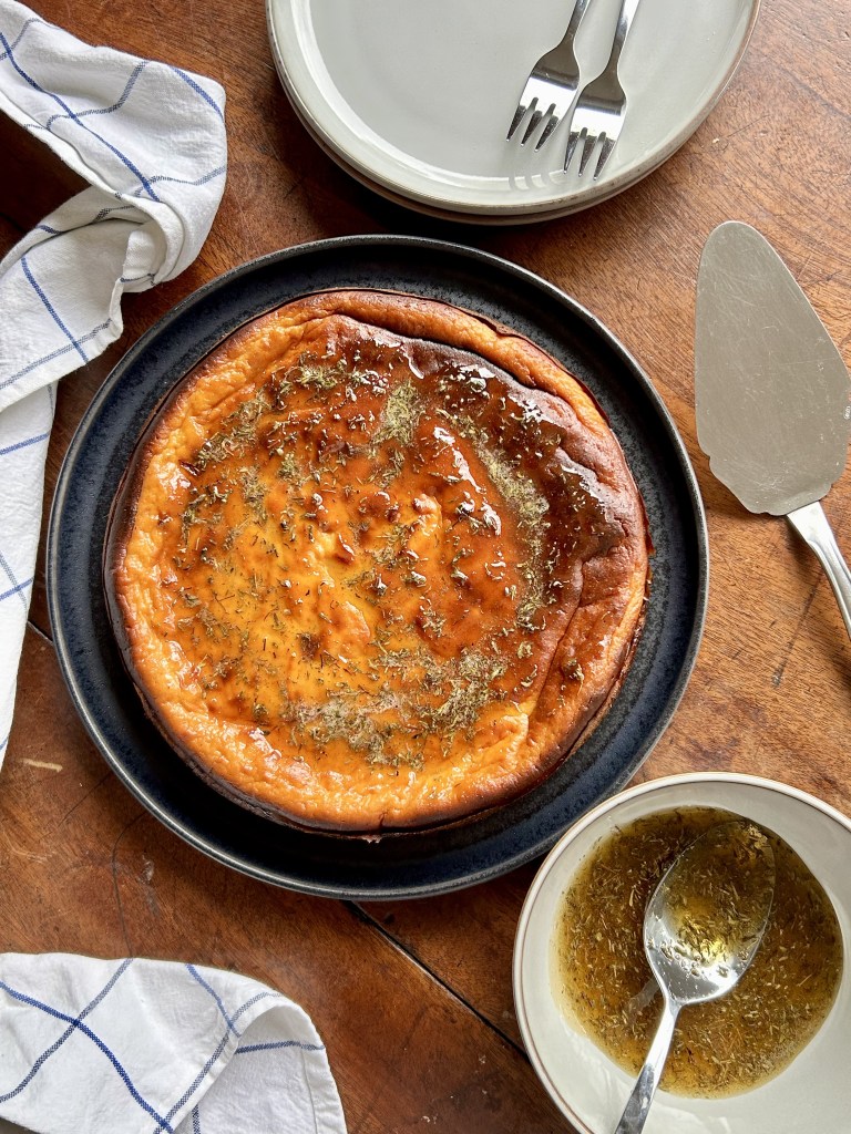 Le temperature delle mie zone mi permettono di accendere il forno. Per cui durante questo fine settimana ritorno ai dolci e vi prego di salvare le ricette di oggi e di domani. Cominciamo con questa torta che va benissimo da mangiare fredda da frigo….ed è una cosa non solo facilissima da fare, ma anche “strabuona” (anche se questo aggettivo non è accettato dal mio traduttore istantaneo… hehe). Non vi dico nulla di nuovo, ma i dolci al miele sono una delle ricette più antiche della storia greca e tradizionalmente venivano offerti agli dei come ringraziamento. Questa versione combina un miele denso e floreale con formaggi locali a pasta molle come l’anthotyros o la mizithra, ma poiché questi possono essere difficili da reperire al di fuori della Grecia, potete sostituirli con la ricotta. Come dicevo prima, si può servire tiepido, come un morbido budino, oppure, ancora più gustoso, nel modo più tradizionale greco: freddo con un espresso nero a parte.
