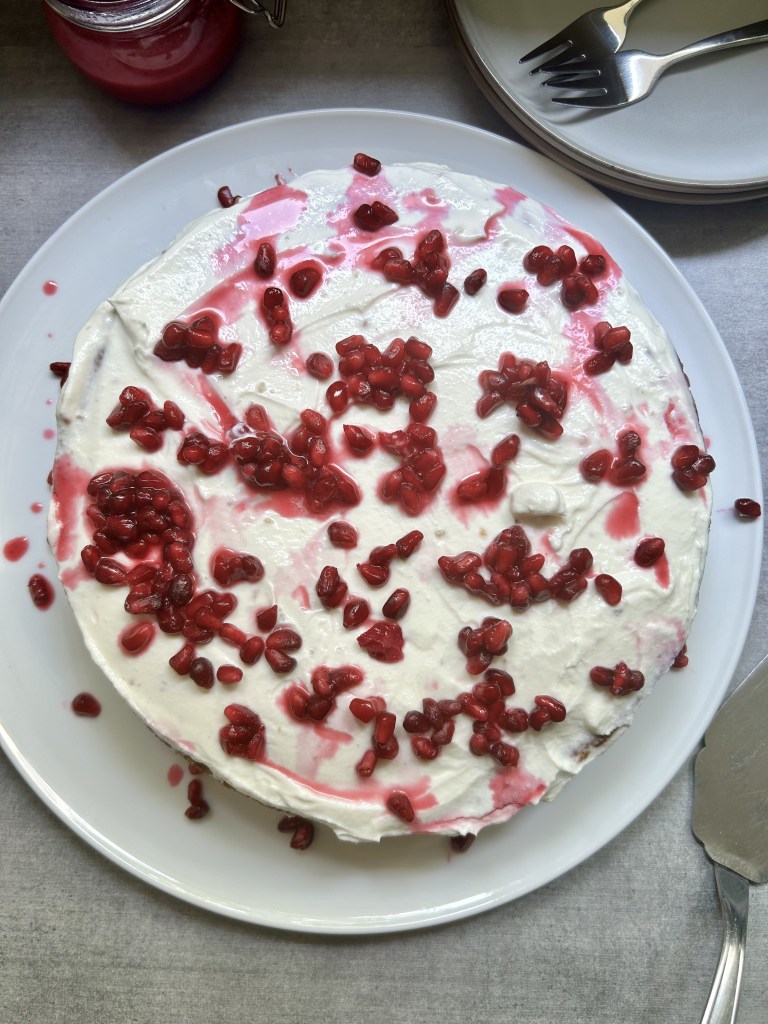 Mettere i semi di melograno in una piccola ciotola con lo zucchero e lasciarli macerare per almeno 30 minuti. Mescolare il mascarpone con lo yogurt e lo zucchero a velo e distribuirlo spesso sulla torta. Completare con i semi di melograno e il loro succo.