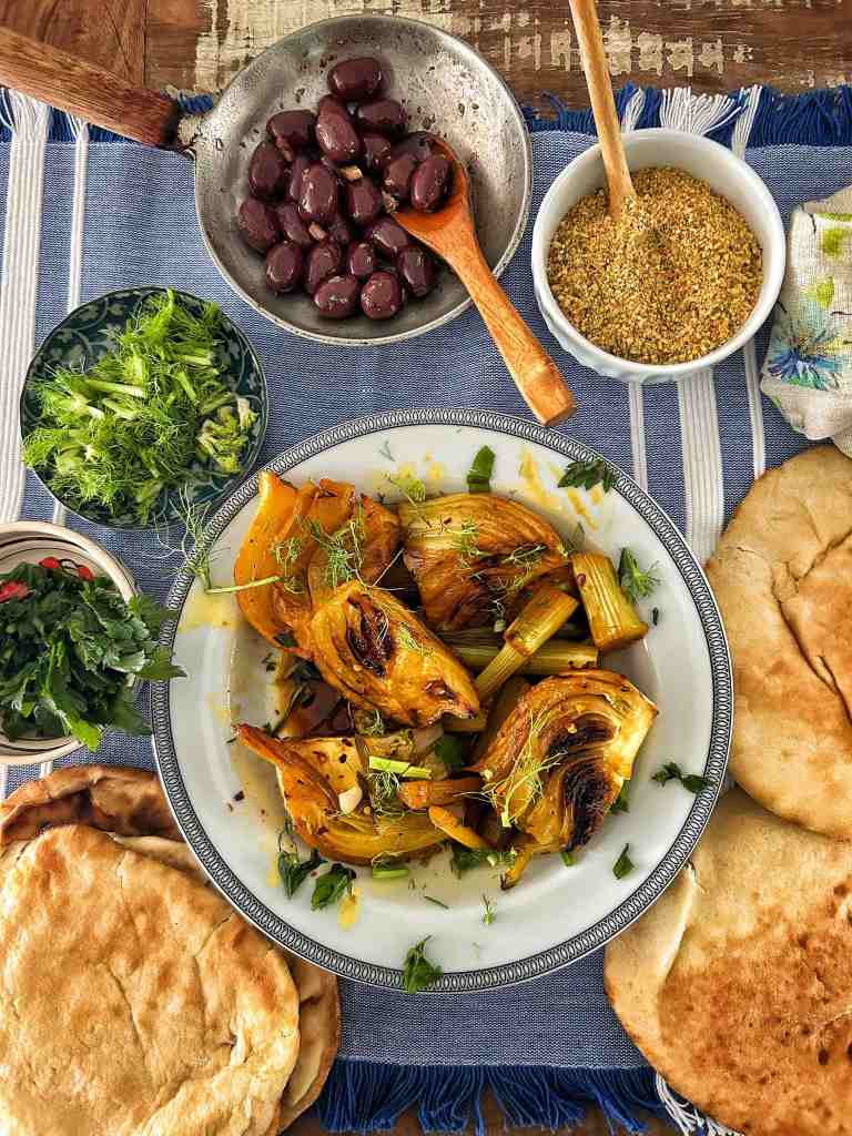 Nel frattempo, raccogliere e tritare grossolanamente il prezzemolo a foglia piatta e tenerlo da parte. Quando i finocchi sono cotti, togliere il coperchio e aumentare la fiamma per cuocere la maggior parte del liquido, lasciandone 5 mm sul fondo. Spegnere il fuoco e lasciare i finocchi nella padella a raffreddare leggermente. Versare l’harissa su un piatto da portata e adagiarvi sopra gli spicchi di finocchio, versare un po’ di succo di cottura e cospargere con le foglie di prezzemolo e il finocchio conservato.