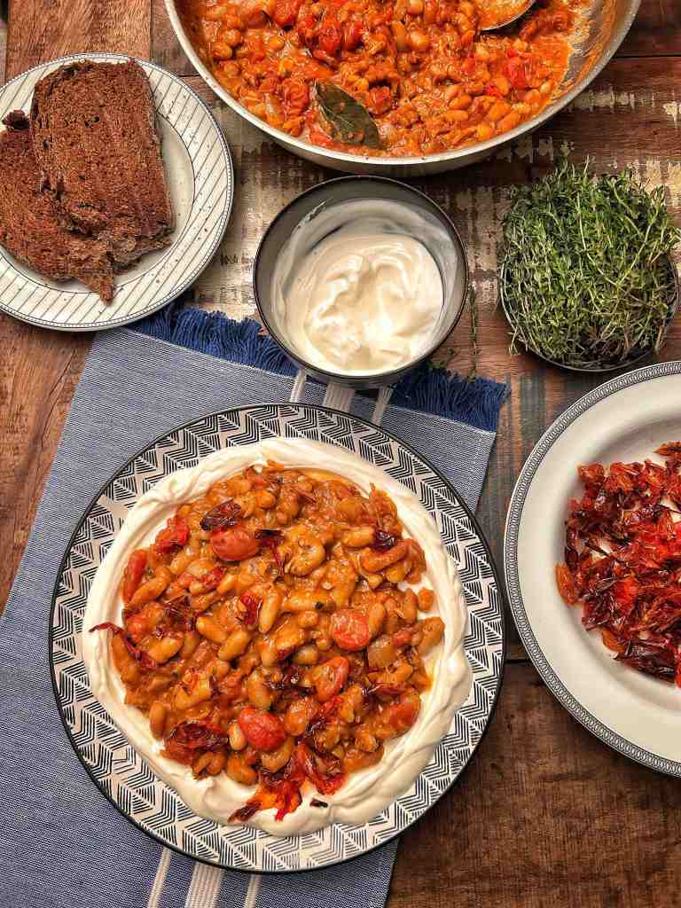 Quando ho portato questo piatto in tavola, dopo aver invitato degli amici brasiliani a cena, c’è stato, devo ammetterlo, qualche iniziale momento di scandalo. I fagioli, amatissimi dal brasiliano, non dovrebbero mai andare d’accordo con lo yogurt, oppure come antipasto, intingolo, o piatto di accompagnamento…. Davanti a qualche sguardo sorpreso, ho aggiunto: “ma questo è Ottolenghi!”, e da lì una difesa del grande Yotam e compagni… Dopo averlo assaggiato, tutti – nessuno escluso! – hanno cominciato a dire queste frasi: “wow”, “ma è buonissimo!”, “non ci credevo!”, e poi anche “amico, ma tu sei molto speciale!”. Quest’ultimo complimento me lo sono preso tutto, anche se ovviamente la ricetta è altrui… La cosa specialissima invece di questa ricetta, oltre al dip di yogurt, è la buccia secca del pomodoro che è diventata croccante, infornata. Ci vuole un po’ di pazienza. Ma tutto ricompensato. Usate i fagioli borlotti, di Spagna, comunque i più grandi che avete. Devono essere morbidi, burrosi e molto cremosi. Vi auguro buon appetito!