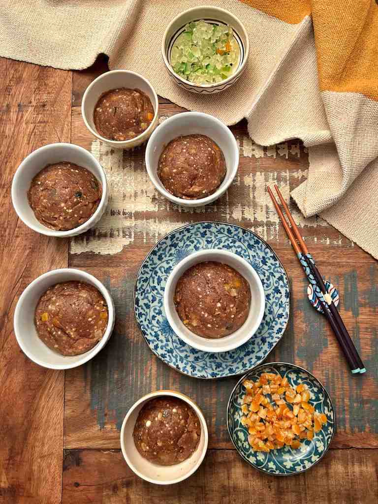 Il procedimento è facilissimo e sui generis. Secondo tradizione si frigge delicatamente la farina di grano nello strutto prima di aggiungere zucchero, frutta candita e noci. In un vecchio libro di cucina sichuanese, pubblicato nel 1977, subito dopo la fine della Rivoluzione Culturale (e che riporta ancora una citazione del Presidente Mao), vi è anche un’altra versione realizzata con farina di riso e olio vegetale anziché strutto, che viene descritta come un piatto preparato dai musulmani. Ad ogni modo, i metodi di entrambe le ricette sono sorprendentemente simili a quelli degli “halvas” preparati per molti secoli in Turchia, Persia e in tutto il Medio Oriente. Sono ben noti i legami tra le tradizioni culinarie dell’Asia centrale e della Cina settentrionale, frutto di almeno 2.000 anni di scambi commerciali lungo l’antica Via della Seta, e molti sono gli echi nella cucina della Cina settentrionale dei dolci, dei pani e dei fagottini che si trovano nelle comunità che attraversano il continente eurasiatico. Nel caso di questo budino, il legame con la religione musulmana suggerisce che potrebbe essere uno dei piatti portati a Chengdu dagli Hui, i musulmani emigrati in città all’inizio della dinastia Qing, con radici molto più antiche nella cucina persiana. La ricetta è tradizionalmente preparata con lo strutto, ma l’olio di cocco è una fantastica alternativa vegetariana. Il risultato è sufficiente per 6-8 porzioni. Mangiatene poco perché è bello denso. Tiepido, così assaporate tutto alla perfezione. Buon capodanno cinese!