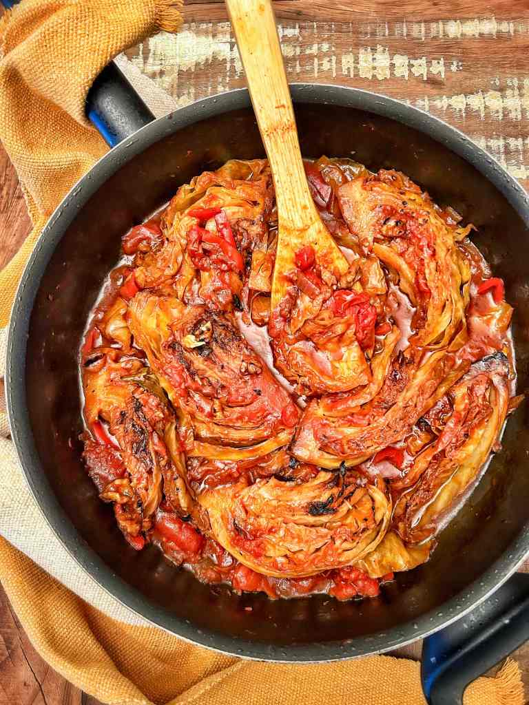 Spuntate il cavolo, eliminando le foglie esterne più dure, e tagliatelo in otto spicchi. Tagliate un po’ del torsolo spesso, ma lasciatene un po’ per tenere insieme le foglie (detto questo, se si staccano non è la fine del mondo, è solo più difficile friggerle). Mettete un’ampia casseruola o una grande padella a fuoco medio e aggiungete tre cucchiai di olio di semi di girasole. Condite e friggete i lati tagliati degli spicchi di cavolo per circa 8-10 minuti, girando a metà cottura, fino a quando non saranno carbonizzati: questo darà un sapore straordinario. Mentre il cavolo scotta, sbucciare e affettare finemente le cipolle. Dimezzare il peperone, rimuovere i semi e affettare finemente. Quando il cavolo è pronto, tenetelo da parte, abbassate un po’ il fuoco e fate soffriggere le cipolle e i peperoni affettati per 10 minuti, aggiungendo i restanti 2 cucchiai di olio di girasole e insaporendoli bene. Quando sono morbide, aggiungere la passata di pomodoro e la paprika dolce alla padella, soffriggere per un paio di minuti e aggiungere i pomodori, lo zucchero, l’alloro e il brodo. Portare a ebollizione, spezzettando i pomodori con il cucchiaio di legno, “e condire bene. Una volta che il sugo bolle, immergere delicatamente gli spicchi di cavolo, con il lato tagliato verso l’alto, e spremere il succo di metà del limone. Insaporire, coprire la padella con un coperchio e abbassare la fiamma al minimo. Cuocere per 45 minuti, finché il cavolo è tenero.