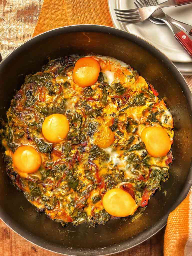 Gli spinaci sono originari dell’Iran e la loro parola deriva proprio dalla lingua farsi, “esfinaj”. Potete cuocere le uova in ramequins individuali, ma si può anche cuocere tutto in una piccola teglia o in una padella da forno, come ho fatto io. E avendo ormai dedotto che gli iraniani sono dei grandi mangiatori di uova e di verdure, vi dico che questa cucina mi piace sempre di più!