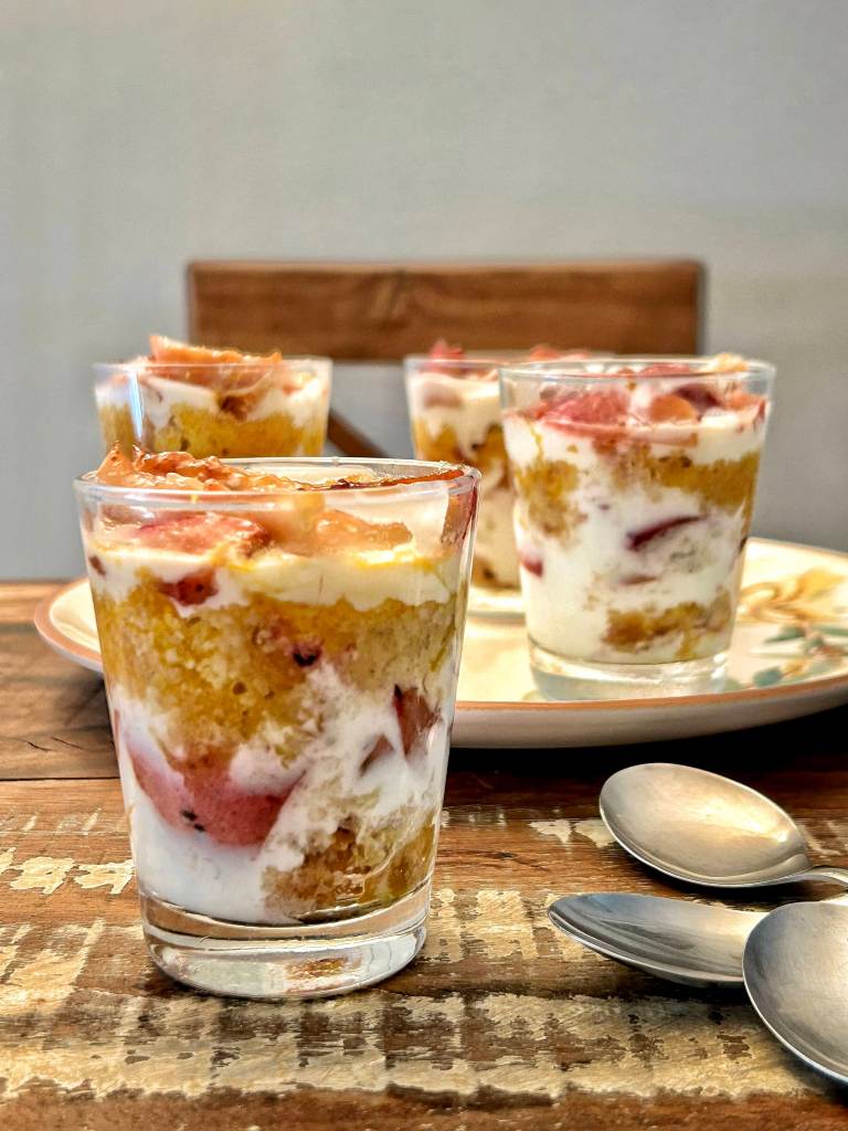 Amo le ricette che combinano i sapori di due o tre continenti. Come questa. È un trifle (che potete fare nei bicchierini come ho fatto io, oppure nella forma in vetro tipica da trifle) che unisce la cultura gastronomica europea con la meravigliosa frutta tropicale che qui in Brasile abbiamo. Ho trovato questo dolce nel libro di David Lebovitz, “Ready for Dessert”, e lui racconta proprio di aver mangiato qualcosa simile in casa di amici che avevano vissuto in Brasile per alcuni anni. Al posto delle fragole ho usato la goiaba, molto più tropicale e divina al gusto. La crema al cocco è il top per ottenere un miracolo di sapori esotici. Potete usare la frutta tropicale che più vi aggrada o quella più facilmente reperibile. Non lasciatevi scappare questa delizia. La faccio spesso, soprattutto se ho avanzi di torta semplice o del pan di Spagna.